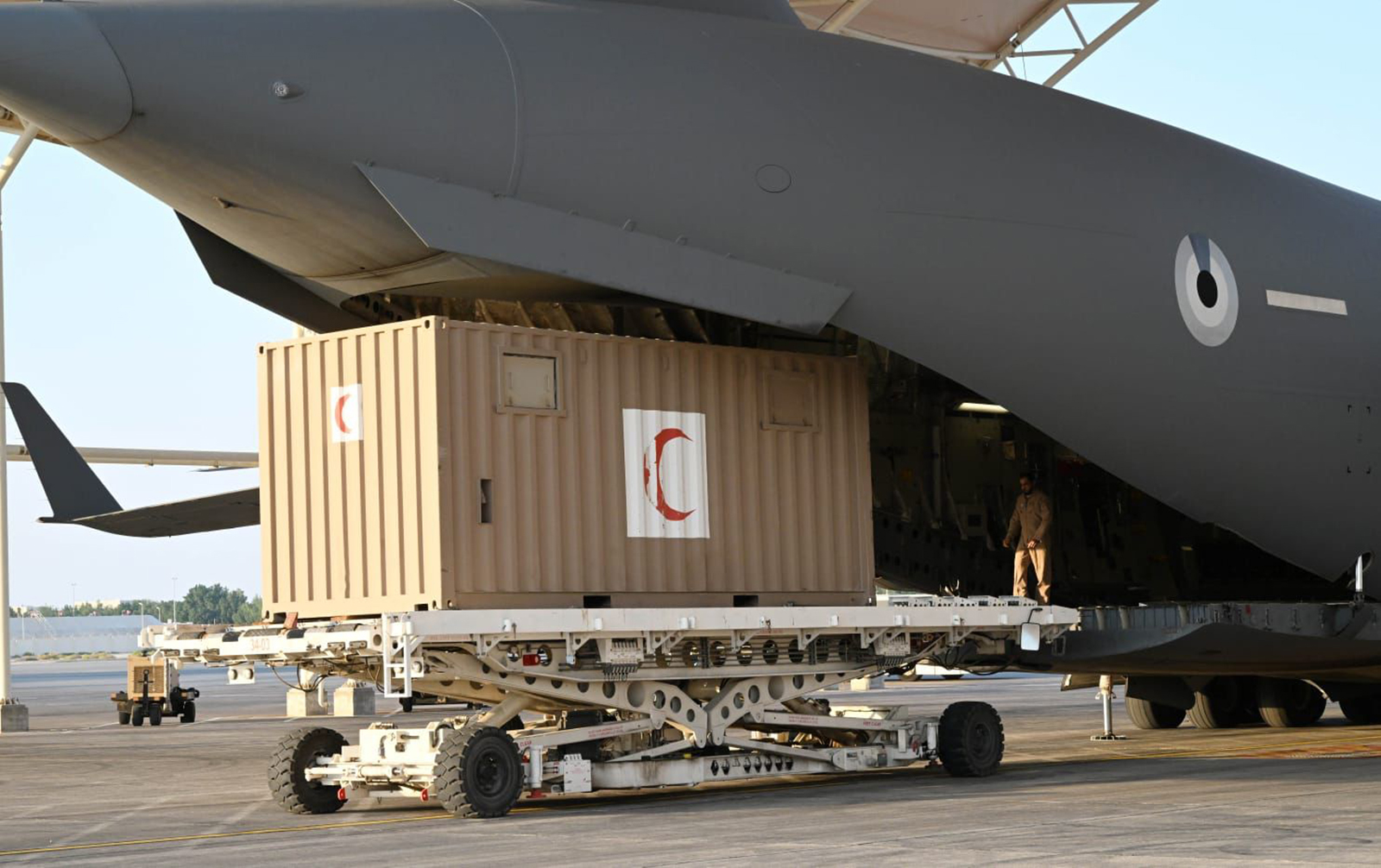 وانطلقت اليوم من مطار أبوظبي الدولي خمس طائرات تحمل جميع المعدات والمتطلبات اللازمة لإقامة المستشفى الميداني وتشغيله، حيث ستفرغ حمولتها في مطار العريش في جمهورية مصر العربية الشقيقة، تمهيداً لنقلها إلى داخل قطاع غزة.