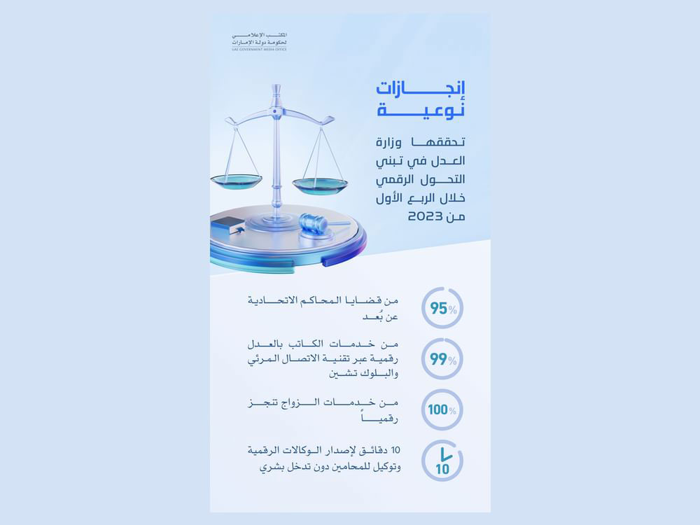 وأكد معالي عبدالله سلطان بن عواد النعيمي أن 95% من جلسات التقاضي في المحاكم بالدولة أصبحت تعقد عن بعد، وأن الجاهزية الرقمية لوزارة العدل بلغت نسبة 100% في ما يتصل بخدمات الزواج الإلكتروني وخدمات الكاتب العدل بالاتصال المرئي وخدمات الطلاق الإلكتروني، بفضل تنفيذ "مشروع تطوير المنظومة القضائية" الذي أطلقته القيادة الرشيدة عام 2021.