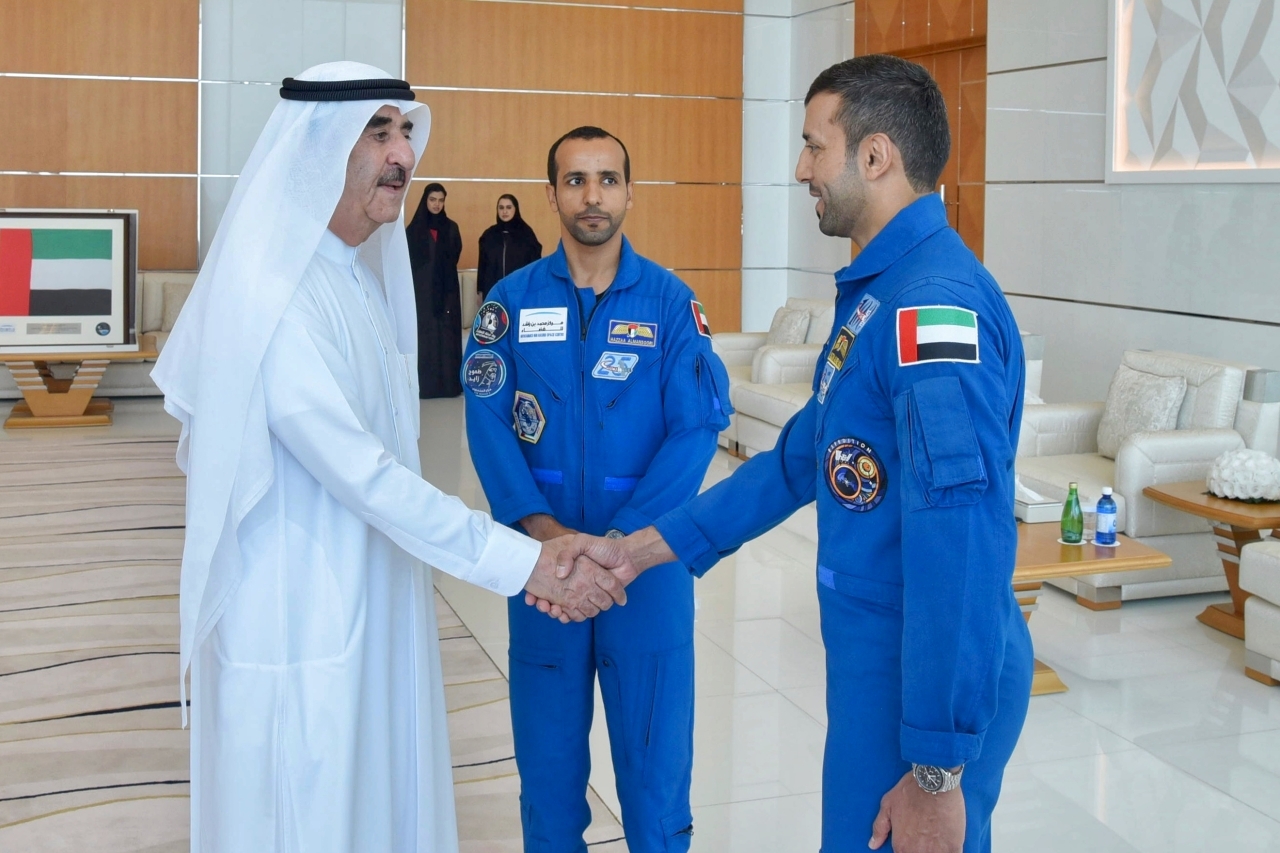 ورحب سموه برائدي الفضاء ووفد المركز وهنأهما بنجاح أطول مهمة فضائية في تاريخ العرب، والتي خاضها رائد الفضاء سلطان النيادي، وامتدت لـ 6 أشهر على متن محطة الفضاء الدولية.