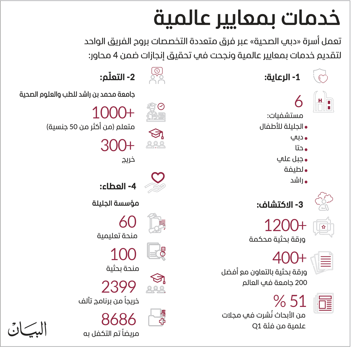 وأضاف: تضع الاستراتيجية الجديدة لـ«دبي الصحية» محور التعلم والاكتشاف أساساً لطبيعة توجهات المرحلة المقبلة، ليكونا امتداداً لتوجيهات القيادة الرشيدة التي تولي البحث العلمي أهمية خاصة باحتسابهما ركيزة أساسية من ركائز الارتقاء بمنظومة الرعاية الصحية في الإمارة.