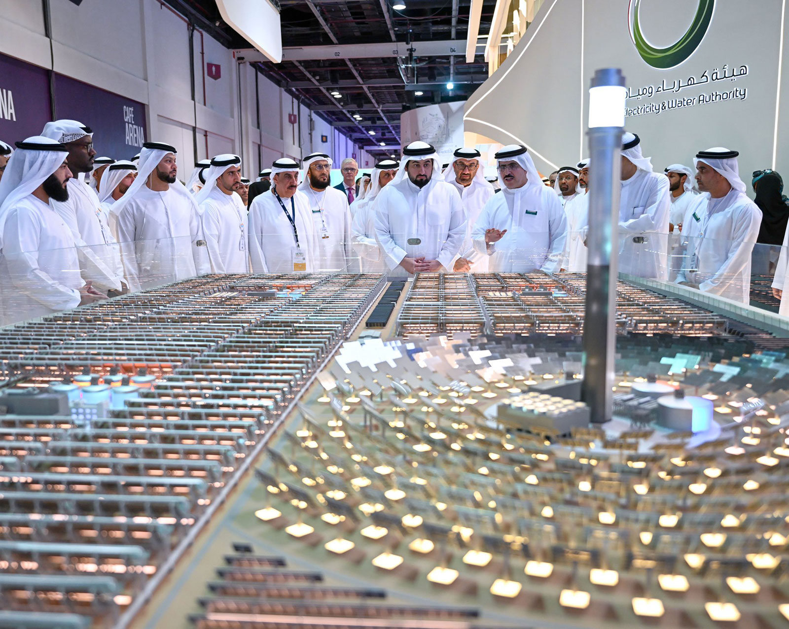 وتوقّف سمو الشيخ أحمد بن محمد بن راشد آل مكتوم عند جناح هيئة كهرباء ومياه دبي حيث اطلّع على أهم مشاريع الهيئة في مجال الاستدامة وأبرزها مجمع محمد بن راشد آل مكتوم للطاقة الشمسية، والذي ستصل قدرته الإجمالية 5000 ميجاوات بحلول 2030 وباستثمارات 50 مليار درهم.
