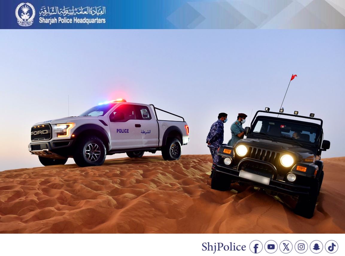 وناشدت شرطة الشارقة أفراد المجتمع من مرتادي المناطق الصحراوية وهواة استعراض ركوب الرمال في المناطق الصحراوية الالتزام بالقوانين والإرشادات الأمنية، محذرة من القيام ببعض الممارسات السلبية الخطيرة؛ التي تشكل خطورة على حياتهم وحياة الآخرين من مرتادي تلك المناطق، راجين السلامة للجميع.