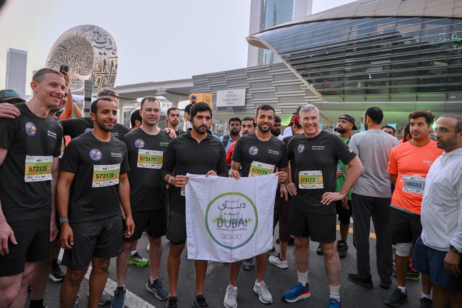وقد شارك إلى جوار سمو ولي عهد دبي رائدا الفضاء دكتور سلطان النيادي وهزاع المنصوري وانضم إليهما رواد الفضاء زملاء النيادي من طاقم "البعثة 69" في رحلته التاريخية على متن محطة الفضاء الدولية، حيث شارك في السباق رواد الفضاء الأمريكيون: ستيفن بوين ووارين هوبيرغ وفرانسيسكو روبيو، ورواد الفضاء الروس: سيرجي بروكوبيف وديمتري بيتلين وأندريه فيديايف، حيث جاءت هذه المشاركة كلفتة تظهر أهمية ممارسة الرياضة كأسلوب حياة وهي الدعوة التي أطلقها سمو الشيخ حمدان بن محمد بن راشد آل مكتوم، من أجل مجتمع صحي حيوي ونشط.