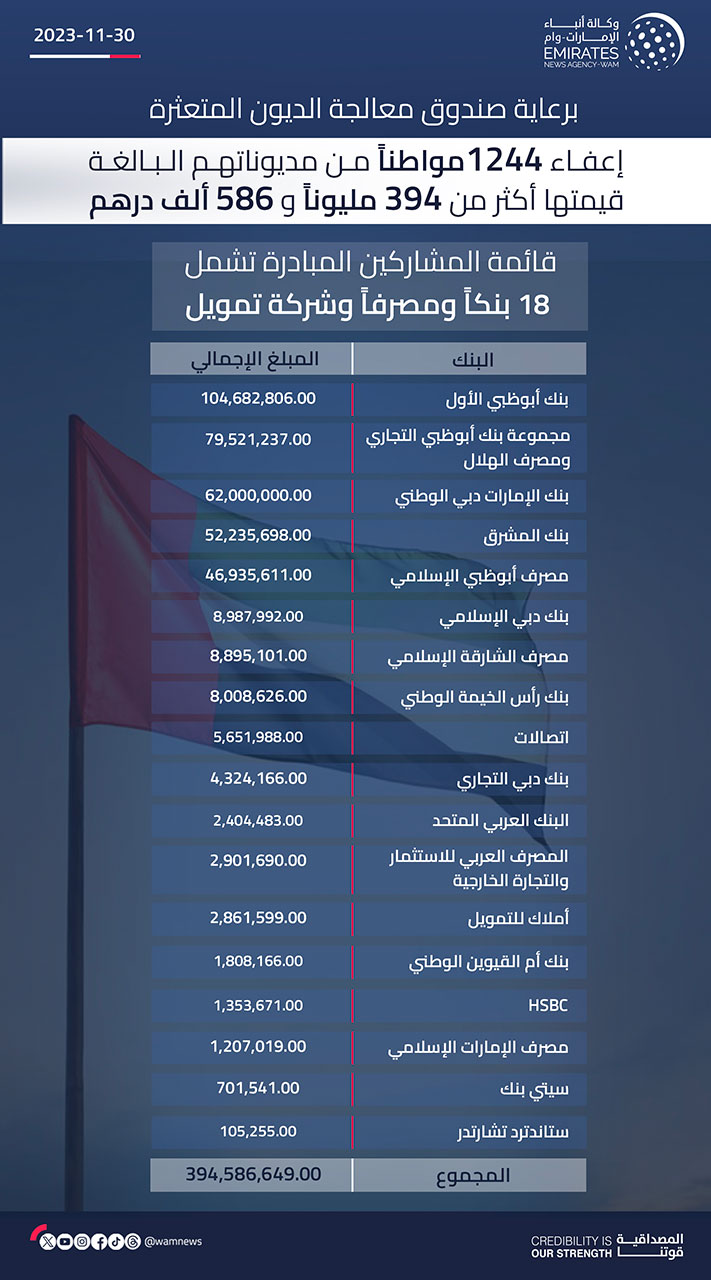 تنفيذاً لتوجيهات صاحب السمو الشيخ محمد بن زايد آل نهيان رئيس الدولة "حفظه الله"، ومتابعة سمو الشيخ منصور بن زايد آل نهيان نائب رئيس الدولة نائب رئيس مجلس الوزراء رئيس ديوان الرئاسة .. أعلن "صندوق معالجة الديون المتعثرة" إعفاء 1244 مواطناً من مديونياتهم بقيمة إجمالية تبلغ 394 مليوناً و586 ألف درهم، وذلك بالتعاون مع 18 بنكاً ومصرفاً ومؤسسة في الدولة.
