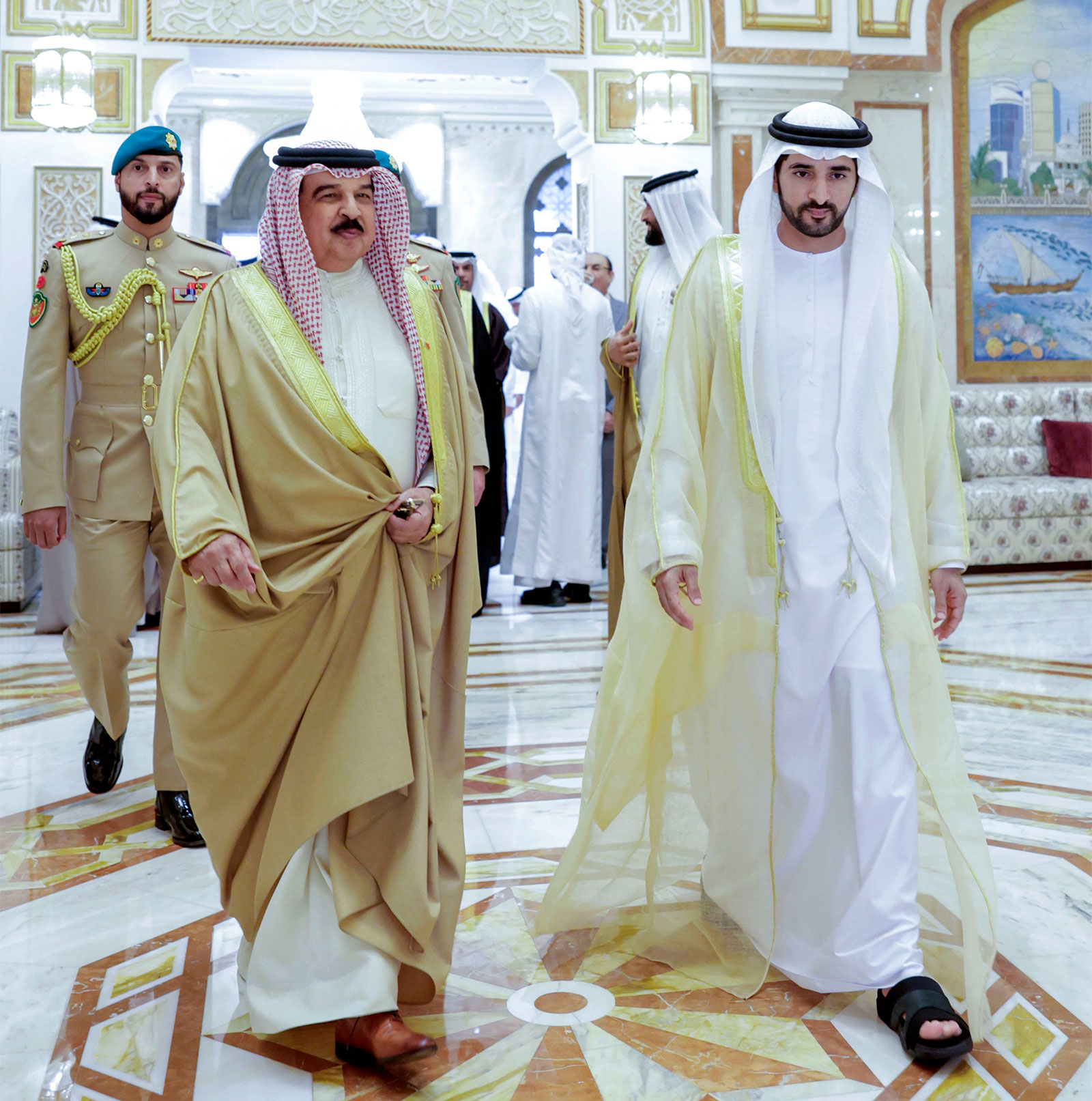 كان في مقدمة مستقبلي جلالته لدى وصوله والوفد المرافق إلى مطار الرئاسة في أبوظبي سمو الشيخ حمدان بن محمد بن راشد آل مكتوم، ولي عهد دبي، وعدد من كبار المسؤولين.