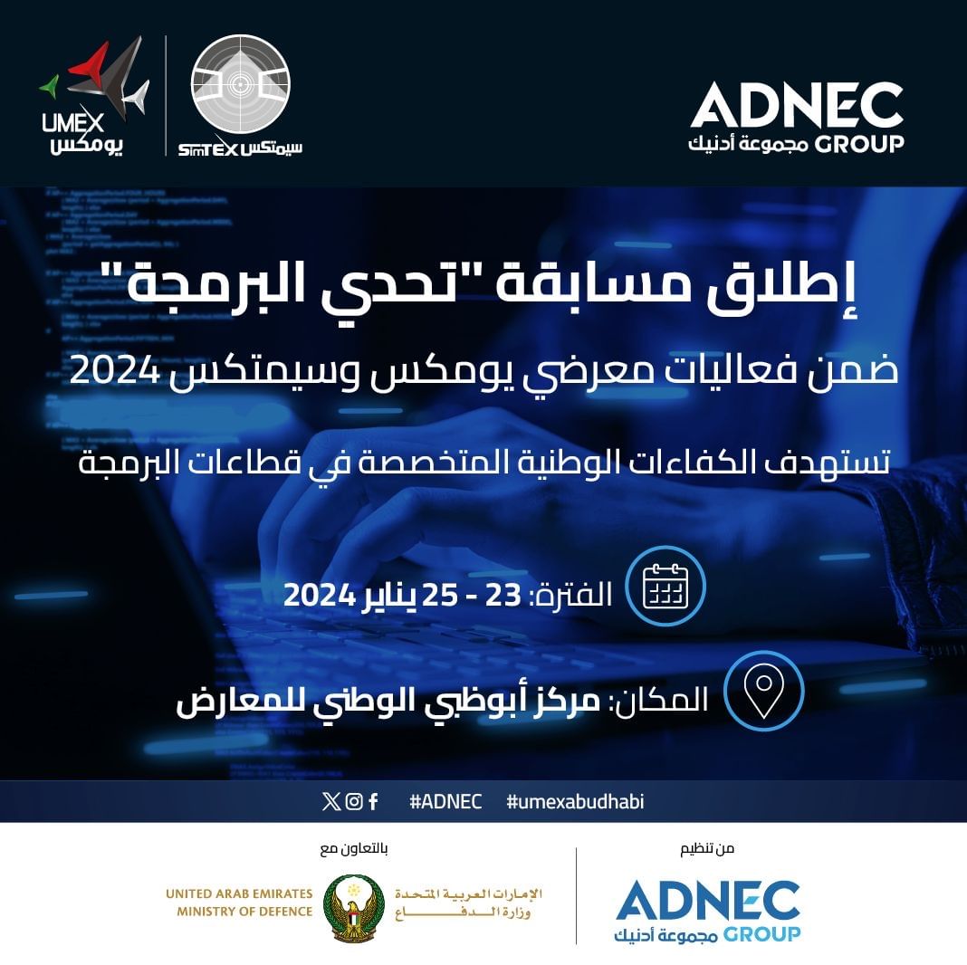 أعلنت اللجنة العليا المنظمة لفعاليات معرضي الأنظمة غير المأهولة يومكس 2024 والمحاكاة والتدريب سيمتكس 2024 عن إطلاق مسابقة “تحدي البرمجة” التي تستهدف الكفاءات الوطنية المتخصصة في قطاعات البرمجة وذلك خلال فعاليات المعرضين المنظمين من قبل مجموعة أدنيك بالتعاون مع وزارة الدفاع المقرر انعقاداها في الفترة 23-25 يناير المقبل في أبوظبي.