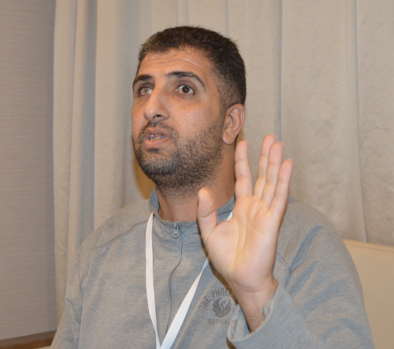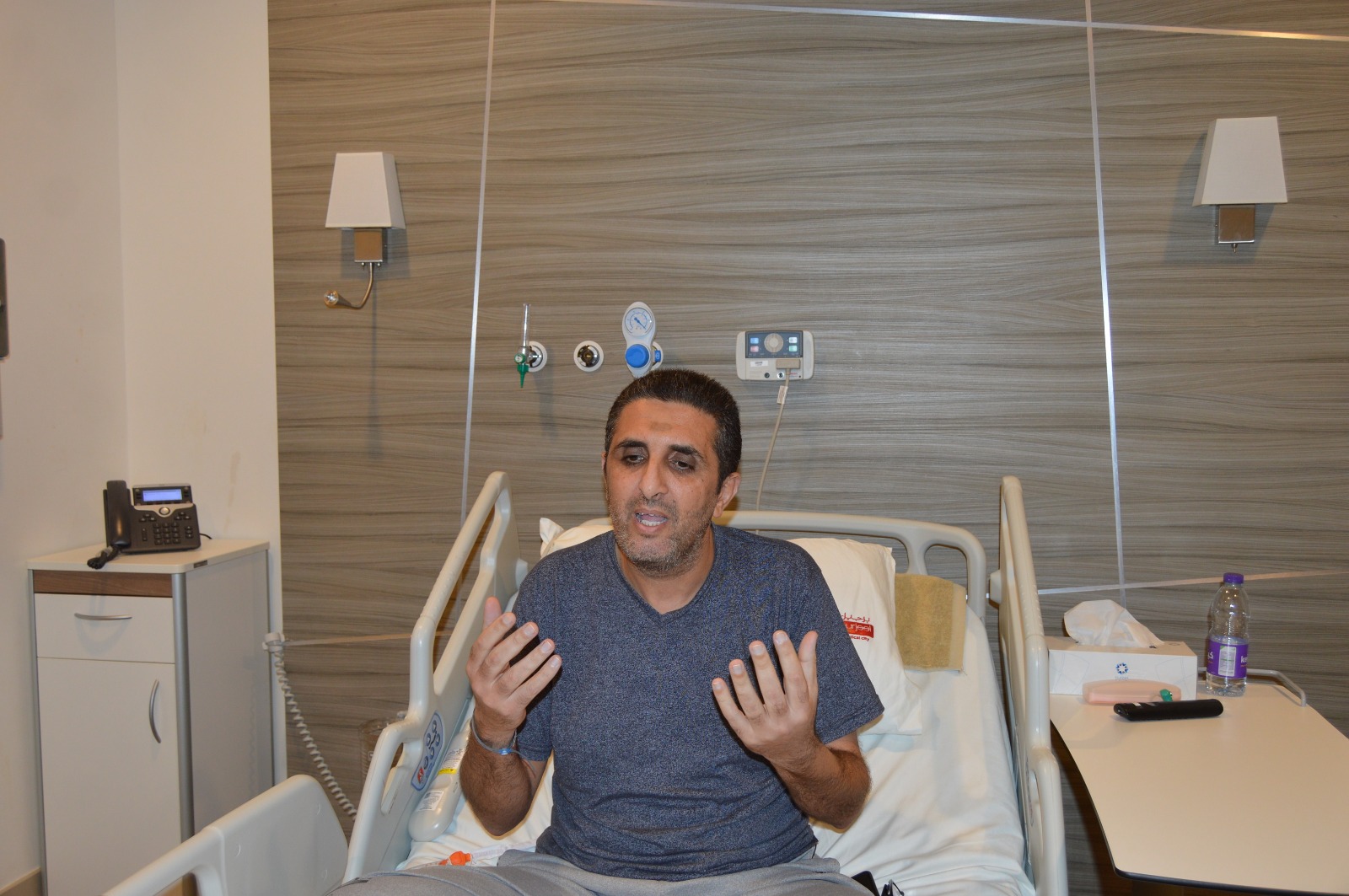 وقال المريض حسام محمد سليمان أبو حطب من خان يونس بقطاع غزة 42 عاما إنه كان يعاني من ورم «الساركوما» وهو نوع نادر من الأورام يتطور فيه الورم في الأنسجة الضامة التي تحيط بمفاصل العظام، ولم يتمكن من تلقي العلاج في القطاع نظرا للأوضاع المأساوية هناك، كما أن مستشفى الصداقة التركي في غزة الوحيد المتخصص بعلاج مرضى السرطان تم تدميره، فقام الطبيب المعالج بالتوصية للعلاج في دولة الإمارات.