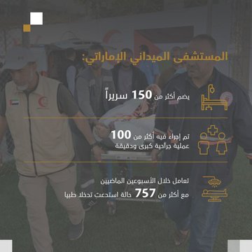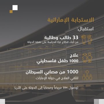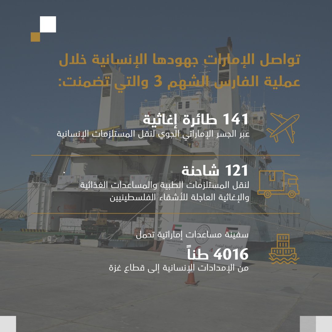 تواصل دولة الإمارات العربية المتحدة جهودها لتقديم الدعم الإنساني والإغاثي للشعب الفلسطيني الشقيق في المجال الصحي والغذائي وتوفير المياه النظيفة ومواد الايواء.
