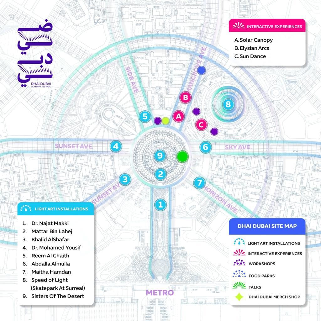 سيعرض مهرجان ضيّ دبي الفني، الذي تنظمه مدينة إكسبو دبي بالشراكة مع شركة AGB Creative، وبدعم من هيئة الثقافة والفنون في دبي، سبعة قطع فنية ضوئية من تصميم فنانين إماراتيين، تعكس نسيج المدينة الغني بالتاريخ السردي والثقافة والتعابير الإبداعية. ومن بين الفنانين والمصممين المشاركين مطر بن لاحج، والدكتورة نجاة مكي، والدكتور محمد يوسف، وعبد الله الملا، وميثاء حمدان، وخالد الشعفار، وريم الغيث.
