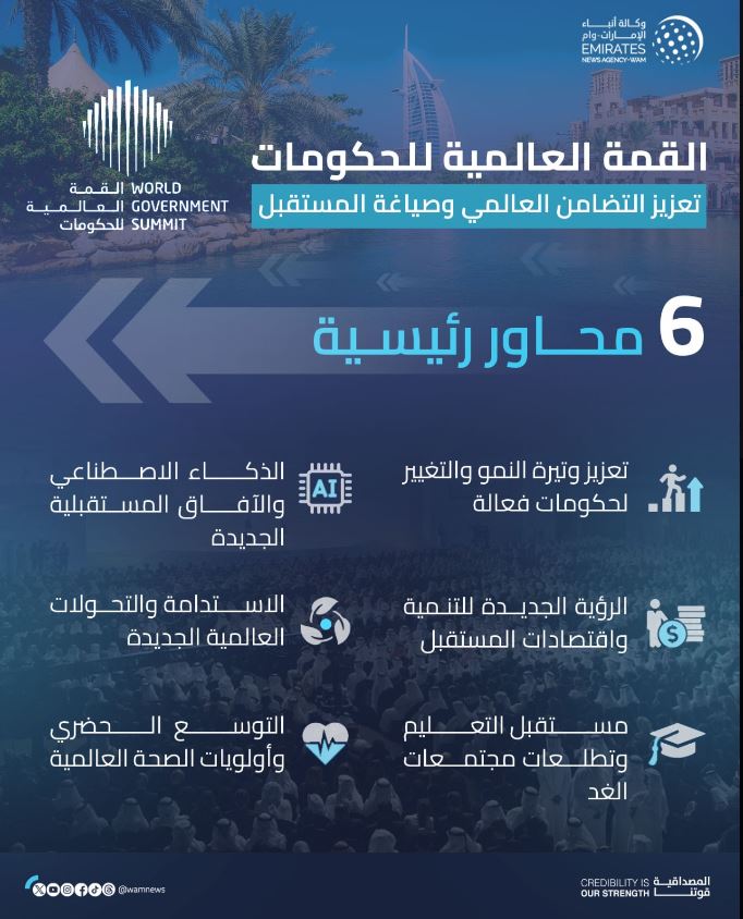 وتركز القمة العالمية للحكومات 2024 على 6 محاور رئيسية ملحة في الوقت الراهن، تشمل تعزيز وتيرة النمو والتغيير لحكومات فعالة، والذكاء الاصطناعي والآفاق المستقبلية الجديدة، والرؤية الجديدة للتنمية واقتصادات المستقبل، ومستقبل التعليم وتطلعات مجتمعات الغد، والاستدامة والتحولات العالمية الجديدة، إضافة إلى التوسع الحضري وأولويات الصحة العالمية.