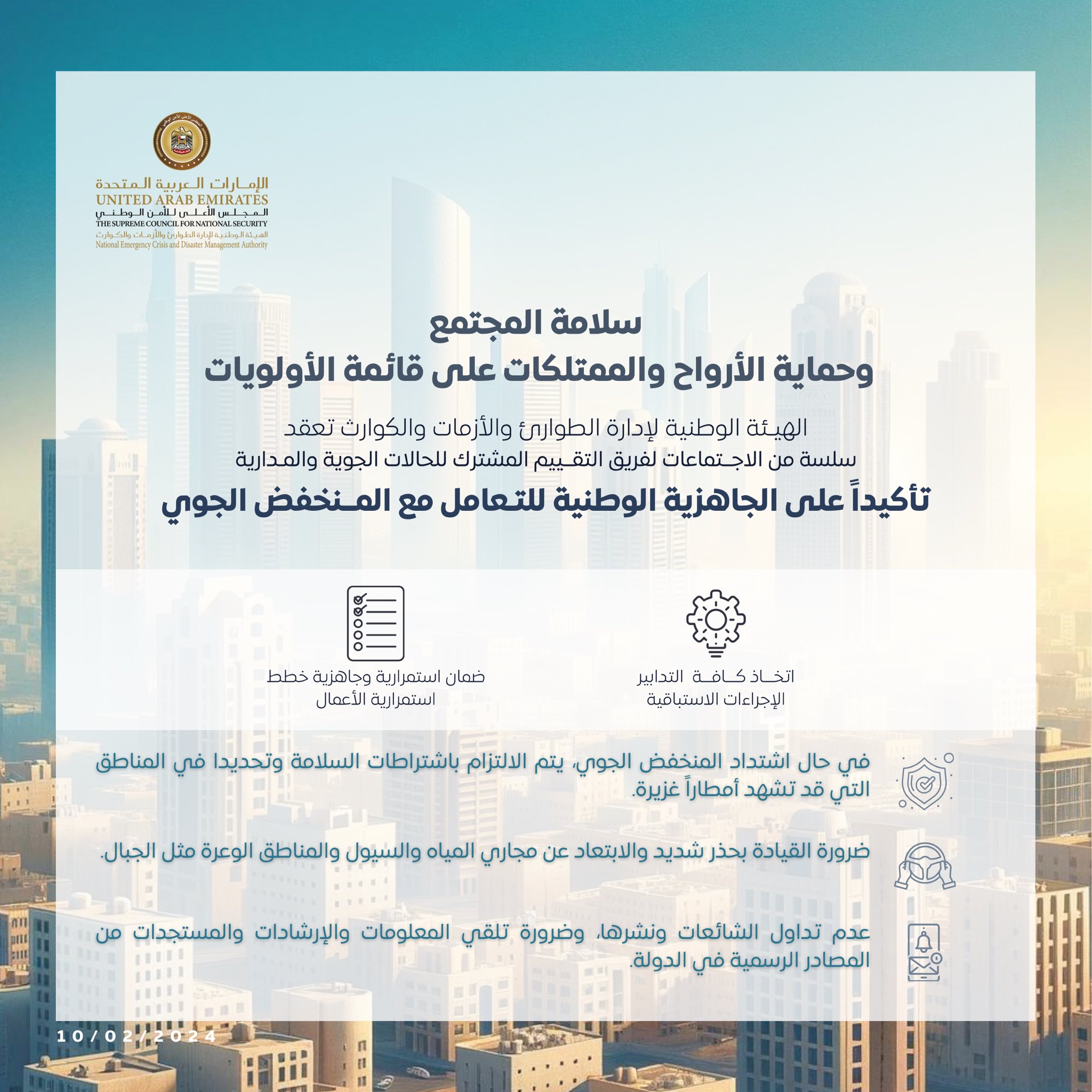 وأكدت الهيئة الوطنية لإدارة الطوارئ والأزمات والكوارث على عدم تداول الشائعات ونشرها، وضرورة تلقي المعلومات والإرشادات والمستجدات من المصادر الرسمية في الدولة.