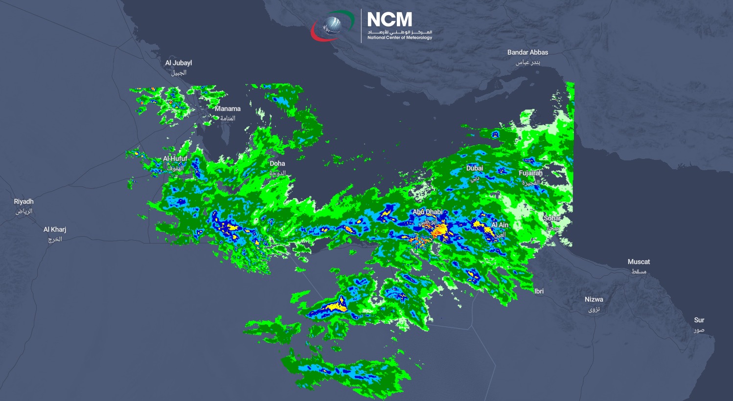 وشهدت إمارة أبوظبي سقوط متفاوتة حيث سقطت أمطار غزيرة ومتوسطة على منطقة الظفرة في مدينة زايد وحبشان وأم ليله وبدع دعفس وبوحصا ومزيرعة وعلى منطقة قرين العيش ومخيرز وغياثي وارزنة وجزيرة دلما والسلع، ومتوسطة على جزيرة أبوظبي والحمرا والخزنة بالعين وخفيفة على المصفح والختم وطريف والمرفأ والطويلة، كما سقطت أمطار خفيفة على خور خوير والرمس برأس الخيمة وخورفكان والخزامية والممزر ومتوسطة على كلباء بالشارقة وعلى الروضة ومشيرف في عجمان والخوانيج في دبي، ومتوسطة على سويحان في العين وعلى دبا الفجيرة.