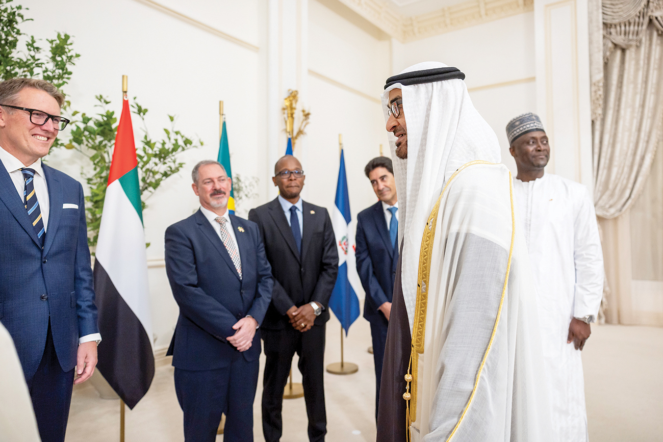 فقد تسلم صاحب السمو رئيس الدولة أوراق اعتماد سعادة كل من..فريدريك فلورين سفير مملكة السويد، وسيدني ليون روميرو سفير جمهورية البرازيل الاتحادية، وسلطان بن عبد الله العنقري سفيرالمملكة العربية السعودية، وجيرفيز مامو سفير جمهورية سيشل، و تولا يوهانا إريولا سفيرة جمهورية فنلندا، ورينسو أنتونيو هيريرا فرانكو سفير جمهورية الدومنيكان وأحمد التازي سفير المملكة المغربية وسليمان كوناني سفير بوركينافاسو ورضوان جدوت سفير أستراليا وسيكو شريفكي كامارا سفير جمهورية غينيا.