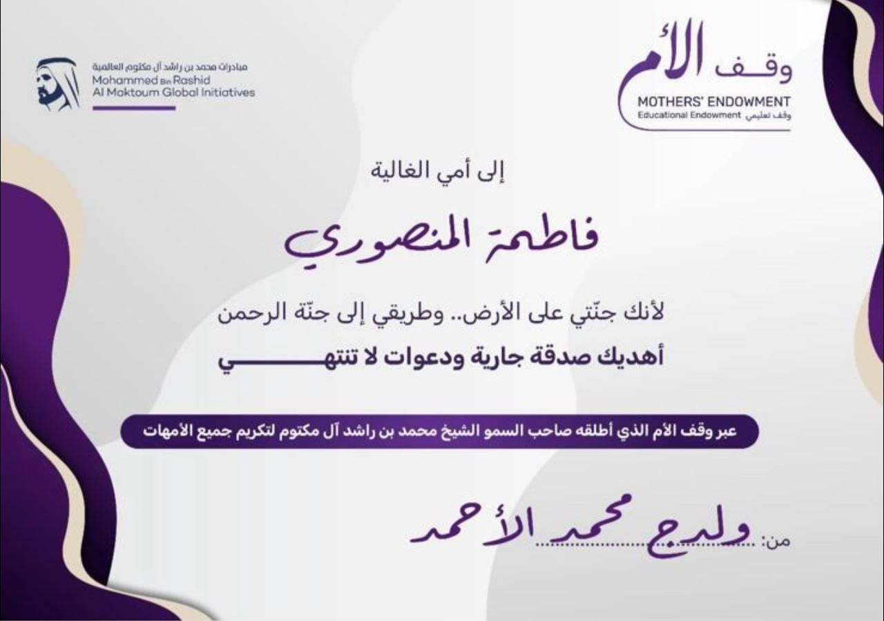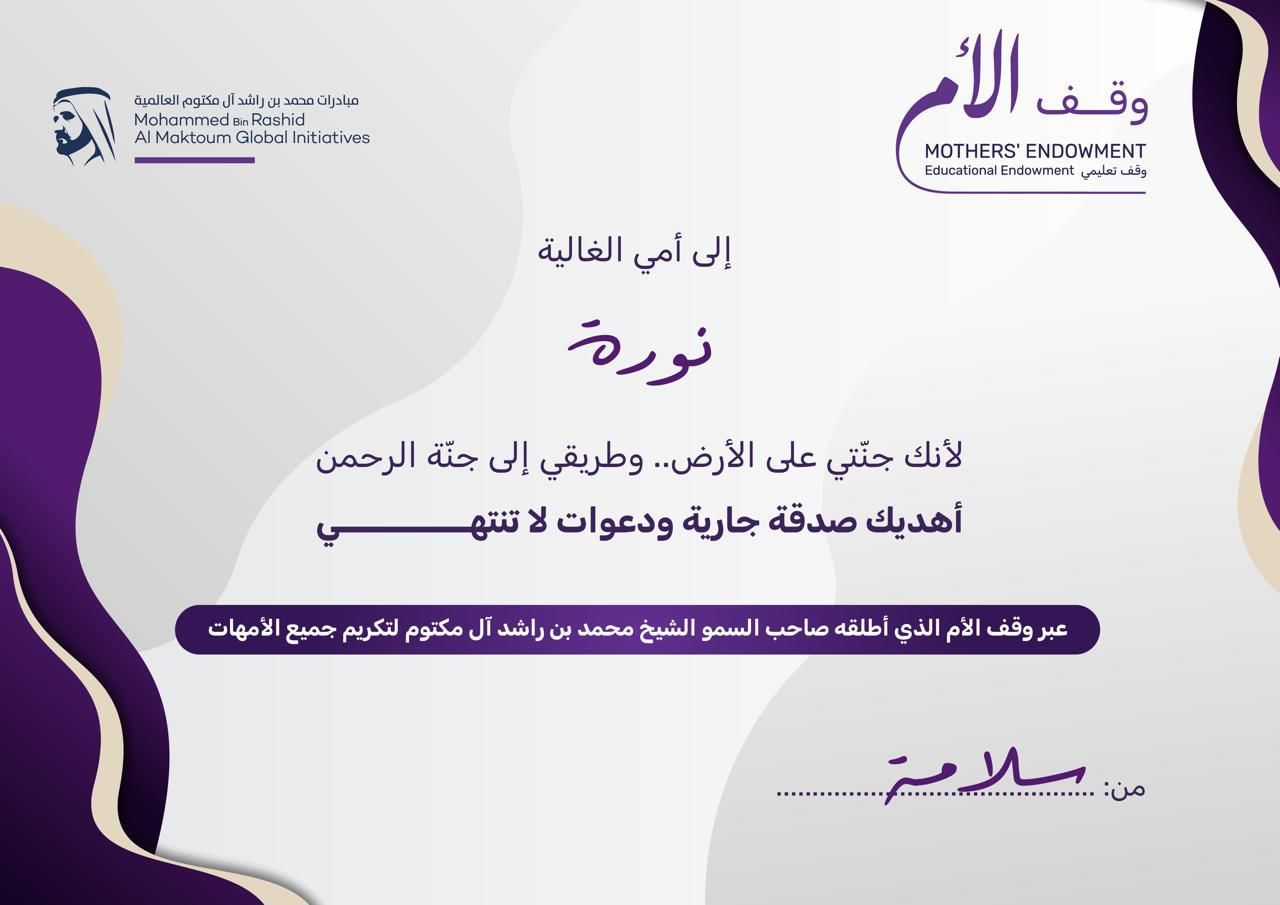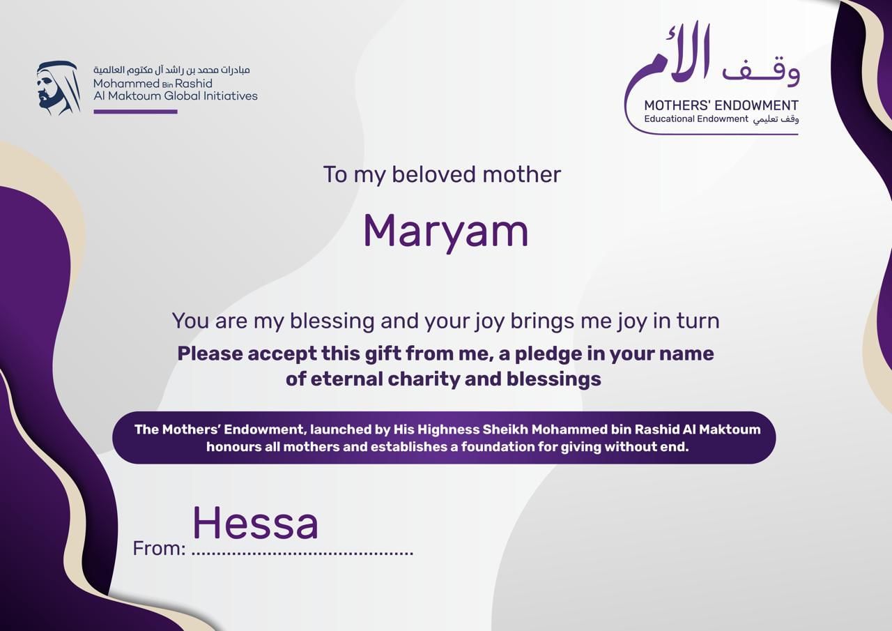 وكانت الحملة أتاحت منذ انطلاقها، إمكانية حصول المتبرع على سند المشاركة بلغة ملؤها المحبة والتقدير، وتقديمها كهدية إلى والدته، باعتبارها صدقة جارية عنها تساهم في إنشاء الصندوق الوقفي لنشر نور العلم في المجتمعات الأقل حظا، وتمكين الملايين من الحصول على فرص لاكتساب المعارف والمهارات والارتقاء بحياتهم نحو الأفضل.