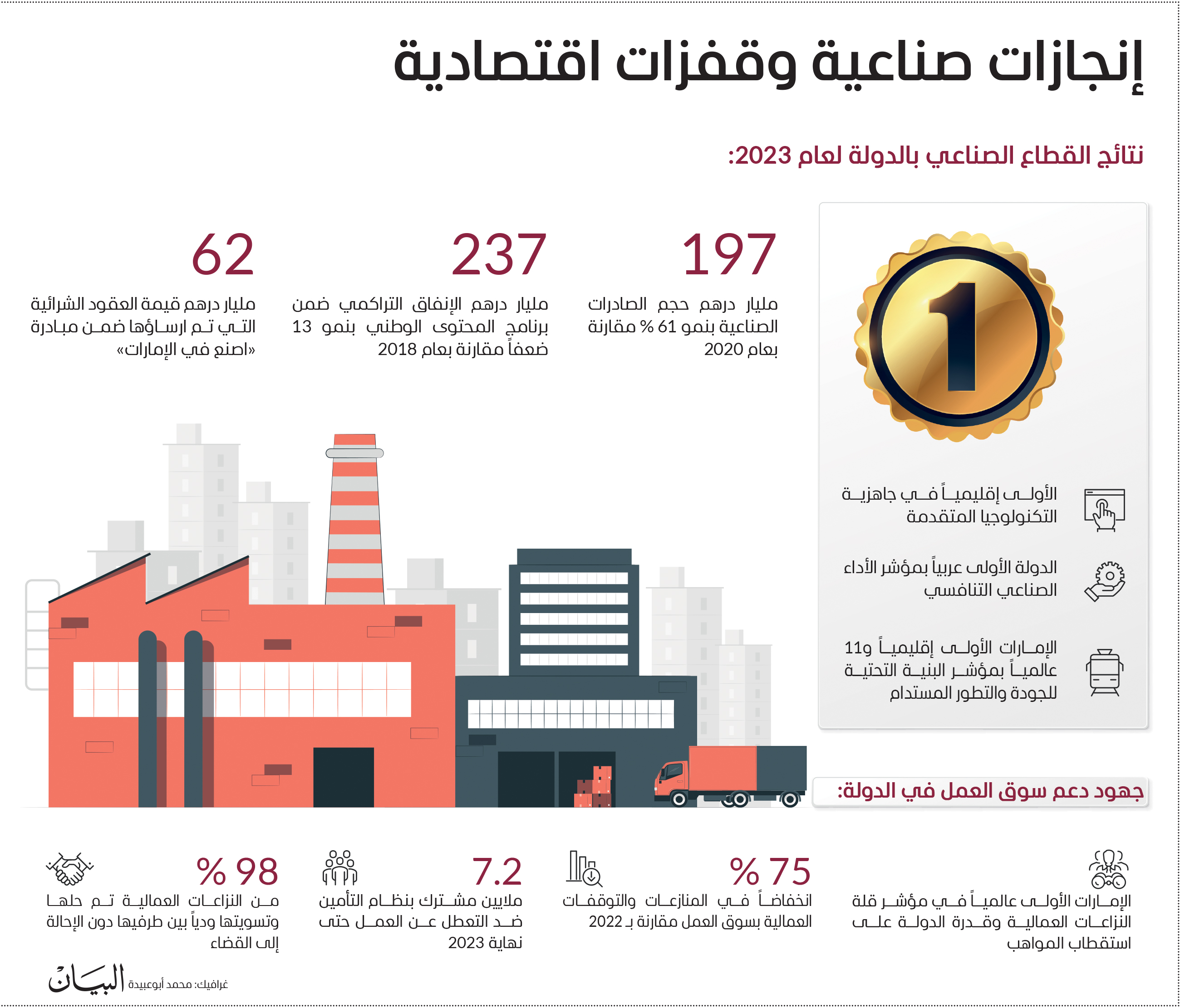 وبلغت مساهمة القطاع الصناعي في الناتج المحلي الإجمالي في عام 2023 ما يقدر بنحو 197 مليار درهم بنسبة نمو 49 % مقارنة بعام 2020، وبلغت الصادرات الصناعية في 2023 ما يقدر بنحو 187 مليار درهم بنسبة نمو 61 % مقارنة بعام 2020، وأسهم قطاعا البتروكيماويات والمنتجات المعدنية بنسبة 38 % من القيمة الصناعية المضافة في عام 2023، وأسهمت قطاعات المعادن ومواد البناء والأغذية والمشروبات بأكثر من 47 % من إجمالي الصادرات الصناعية في عام 2023.