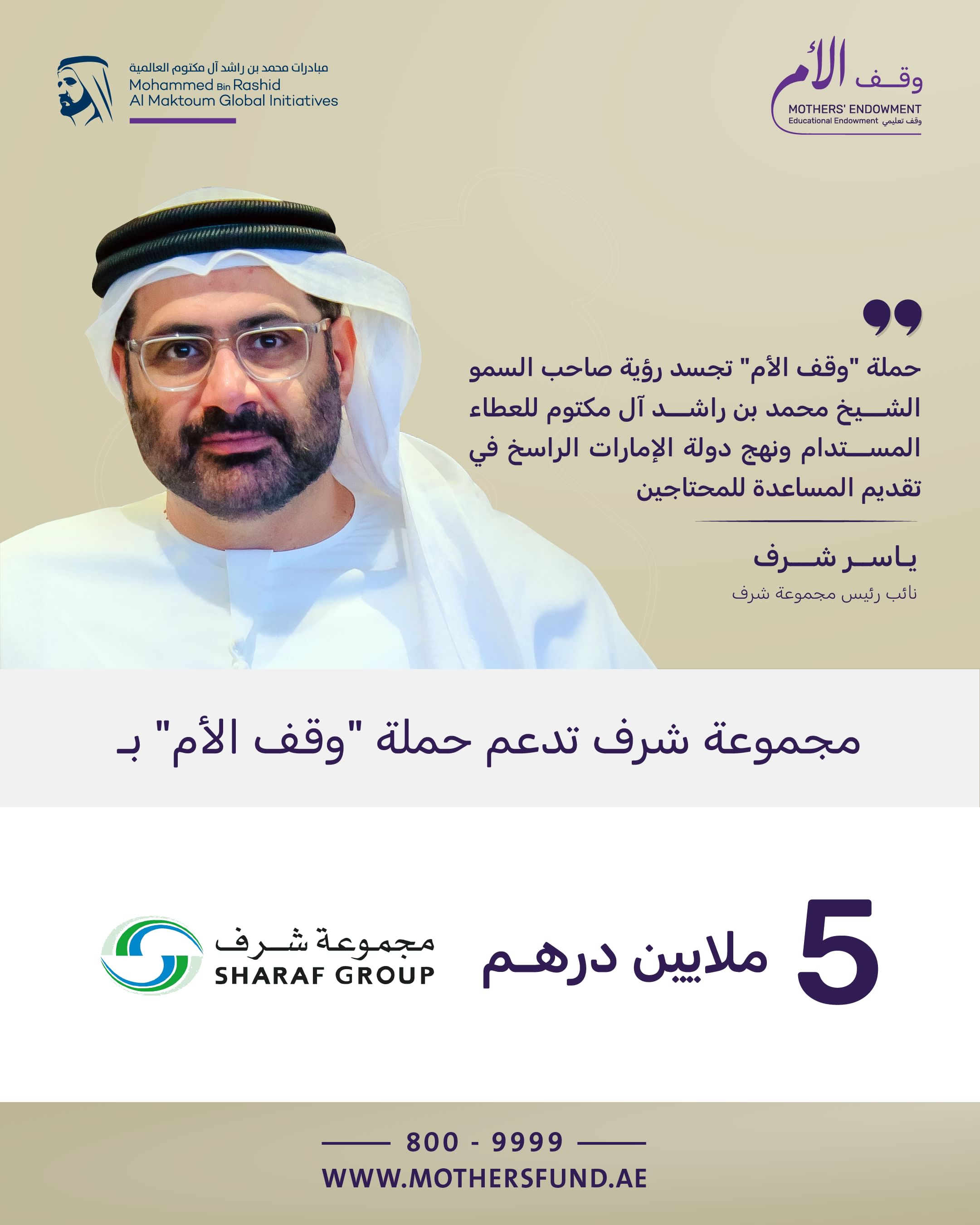 وقال ياسر شرف، نائب رئيس مجموعة شرف " تجسد حملة وقف الأم رؤية صاحب السمو الشيخ محمد بن راشد آل مكتوم للعطاء المستدام، ونهج دولة الإمارات الراسخ في تقديم المساعدة للمحتاجين، والتخفيف من معاناة المجتمعات الأقل حظاً، وإتاحة الفرصة أمام أبنائها للحصول على التعليم الجيد وتطوير إمكاناتهم ومهاراتهم".