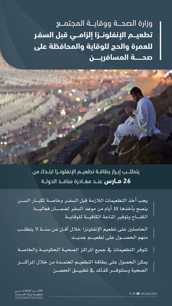 وأفادت الوزارة أنه سيتم العمل على طلب إبراز بطاقات تطعيم الانفلونزا للمسافرين إلى العمرة ابتداءً من تاريخ 26 مارس 2024، فيما أوصت بأهمية زيارة المركز الصحي قبل مغادرة الدولة بفترة كافية، ولا سيما في حال وجود أمراض مزمنة، مشيرة إلى توفر التطعيمات في جميع المراكز الصحية الحكومية والخاصة. وذلك في إطار استراتيجية الوزارة الرامية إلى وقاية المجتمع من جميع المخاطر والأمراض المعدية والسارية والسيطرة عليها.