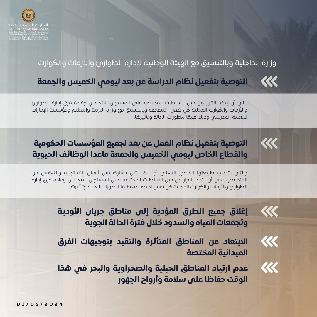 هذا وبناءً على الحالة الجوية المتوقعة أوصت وزارة الداخلية بالتنسيق مع الهيئة الوطنية لإدارة الطوارئ والأزمات والكوارث بتفعيل نظام الدراسة عن بعد ليومي الخميس والجمعة لجميع المؤسسات التعليمية على أن يتخذ القرار من قبل السلطات المختصة على المستوى الاتحادي وقادة فرق إدارة الطوارئ والأزمات والكوارث المحلية كلٍ ضمن اختصاصه وبالتنسيق مع وزارة التربية والتعليم ومؤسسة الإمارات للتعليم المدرسي وذلك طبقا لتطورات الحالة وتأثيرها.