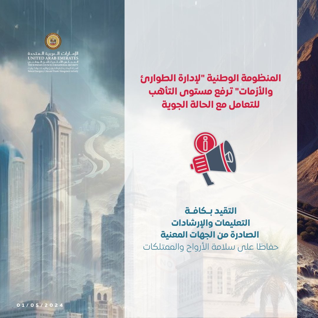 ومن خلال عقد سلسلة من الاجتماعات لفريق التقييم المشترك للحالات الجوية والمدارية التي كانت برئاسة الهيئة الوطنية لإدارة الطوارئ والأزمات والكوارث ومشاركة كل من وزارة الداخلية والمركز الوطني للأرصاد وجهات حكومية ذات العلاقة، تم التأكيد على ضرورة تفعيل خطط استمرارية الأعمال، واستمرار المتابعة والتقييم للحالة الجوية وتأثيراتها على كافة مناطق الدولة.