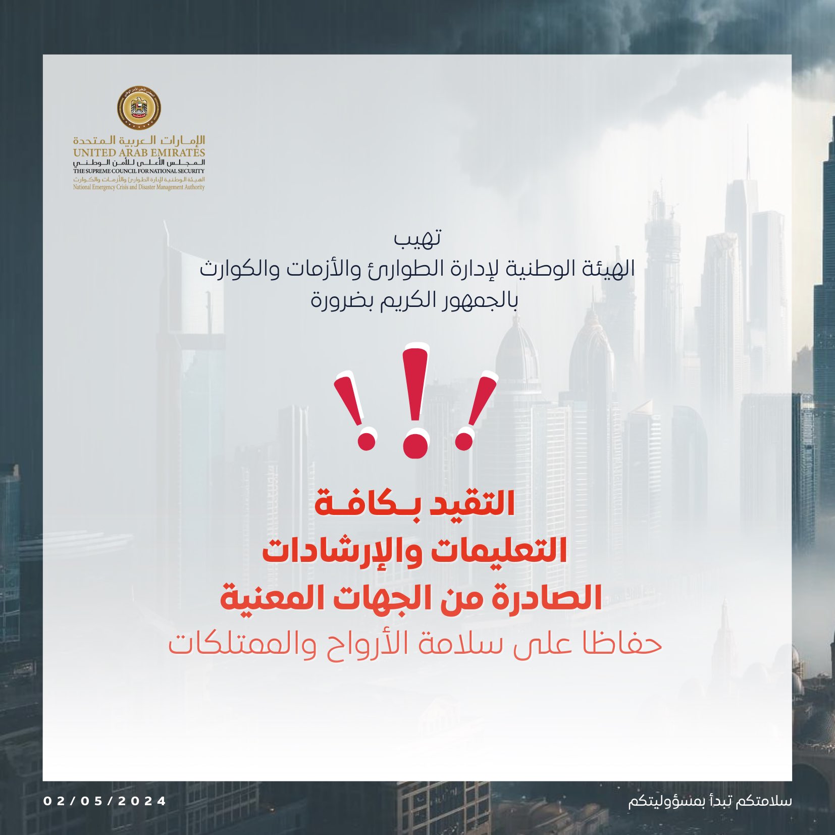 كما قررت وزارة الداخلية وبالتنسيق مع هيئة الطوارئ والأزمات إغلاق جميع الطرق المؤدية إلى مناطق جريان الأودية وتجمعات المياه والسدود خلال فترة الحالة الجوية، وأهابتا بالجمهور الكريم إلى الابتعاد عن هذه المناطق والتقيد بتوجيهات الفرق الميدانية المختصة وعدم ارتياد المناطق الجبلية والصحراوية والبحر في هذا الوقت حفاظا على سلامتهم وأرواحهم وضرورة اتباع كافة الإجراءات التي ستعلن عنها الجهات الرسمية واستقاء المعلومات الصحيحة من المصادر الرسمية في الدولة، وتجنب تداول الشائعات والمعلومات المغلوطة.