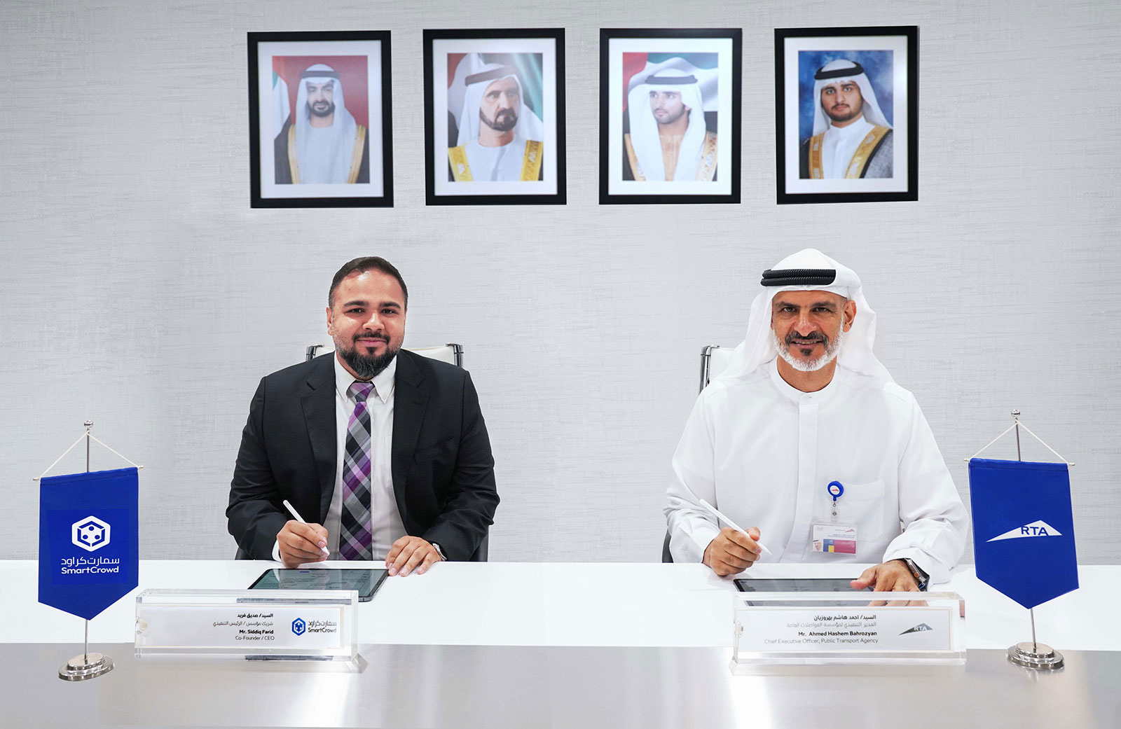 وقّع الاتفاقية عن هيئة الطرق والمواصلات، أحمد هاشم بهروزيان، المدير التنفيذي لمؤسسة المواصلات العامة، ووقعها عن شركة سمارت كراود، صدّيق فريد، الشريك المؤسس والرئيس التنفيذي للشركة. وقد جرى توقيع مذكرة التفاهم في المبنى الرئيس للهيئة مؤخرا.