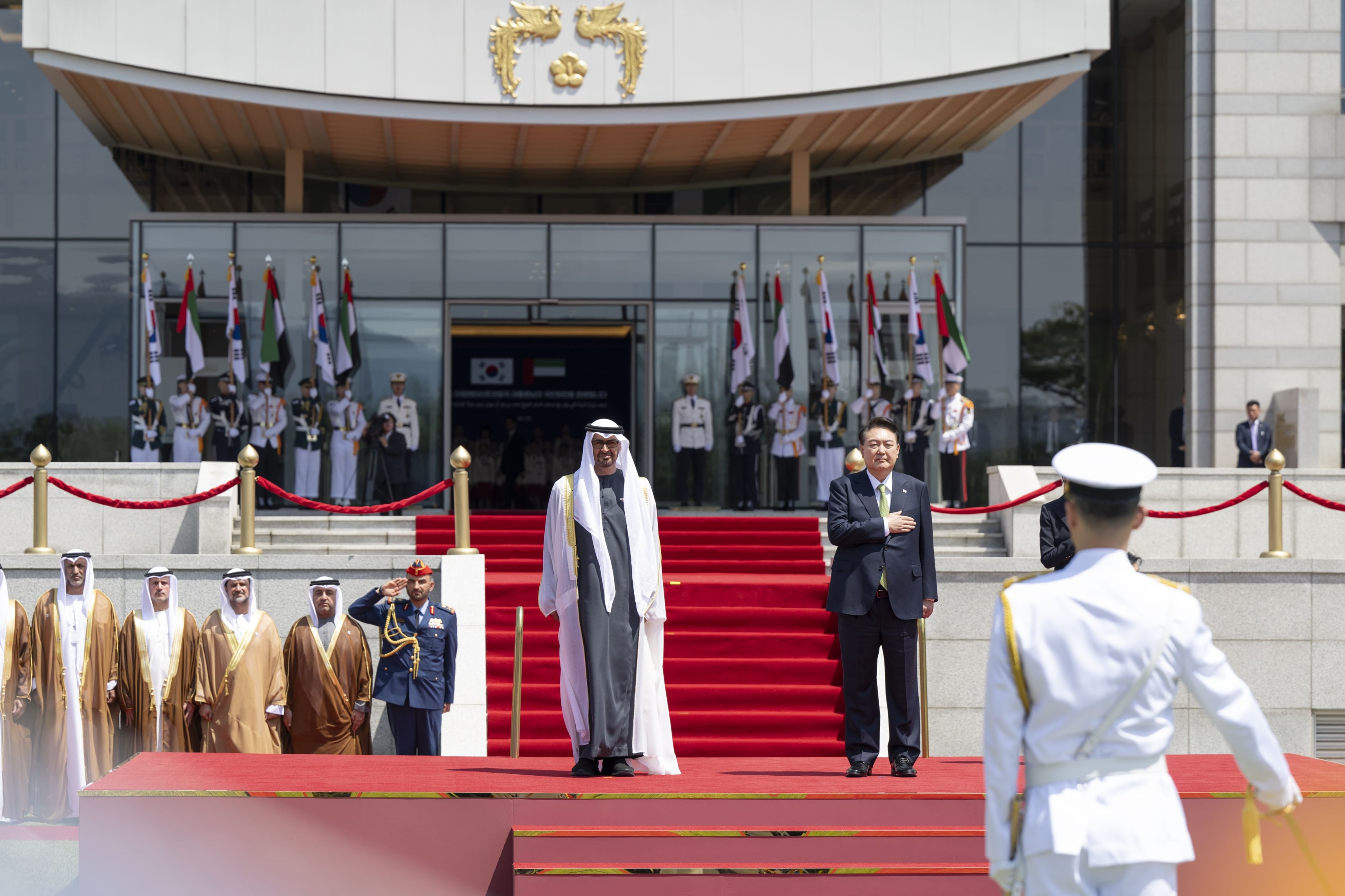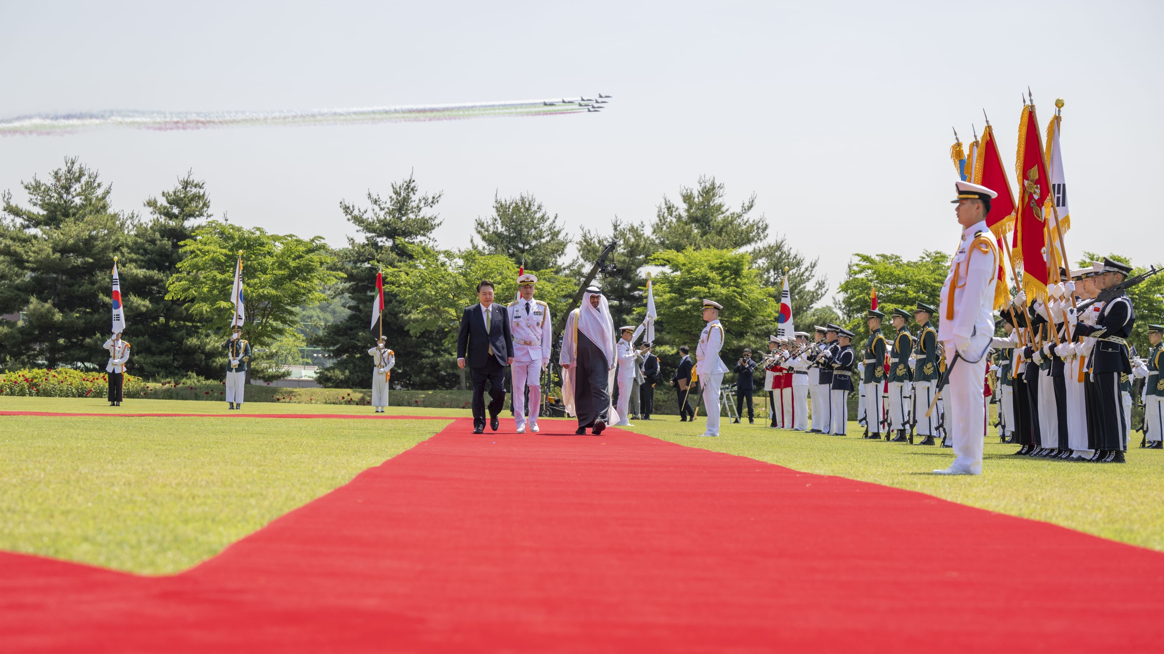 وجرت لسموه مراسم استقبال رسمية ـ لدى وصوله مكتب الرئاسة في سيؤول ـ حيث قدمت طائرات كورية استعراضات ترحيبية .. فيما أطلقت المدفعية 21 طلقة واصطفت ثلة من حرس الشرف تحية لسموه.. وعزف السلام الوطني لكل من دولة الإمارات وكوريا.