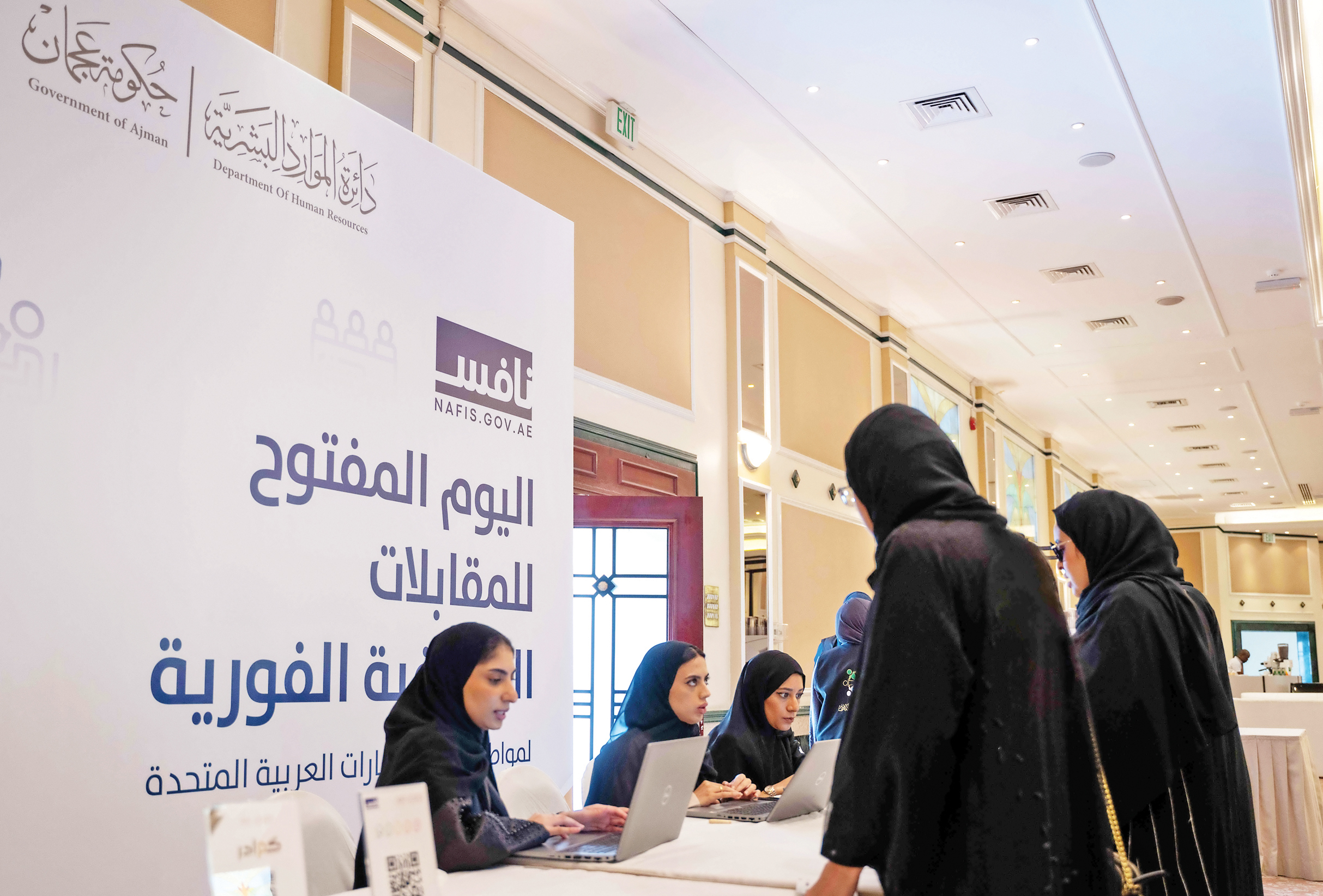 نظمت دائرة الموارد البشرية في حكومة عجمان، بالتعاون مع وزارة الموارد البشرية والتوطين ومجلس تنافسية الكوادر الإماراتية «نافس»، يوماً مفتوحاً للمقابلات الوظيفية الفورية في مقر جمعية أم المؤمنين بعجمان.