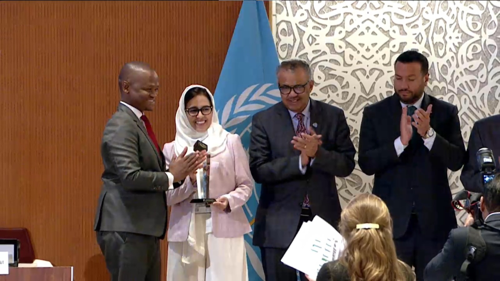 سلّم الدكتور تيدروس أدحانوم غيبريسوس المدير العام لمنظمة الصحة العالمية والدكتور حسين عبد الرحمن الرند وكيل وزارة الصحة ووقاية المجتمع المساعد للصحة العامة، جائزة مؤسسة الإمارات للصحة لعام 2024 للنظام الوطني لتسجيل الوفيات في المملكة العربية السعودية التابع لوزارة الصحة السعودية، وقد تسلمت الجائزة الدكتورة مرام العتيبي الرئيس التنفيذي لمركز الخدمات الصحية المساندة بوزارة الصحة السعودية، وذلك ضمن احتفالية خاصة على هامش اجتماعات جمعية الصحة العالمية السابعة والسبعون لمنظمة الصحة العالمية التي تختتم أعمالها غدا 1 يونيو في جنيف.