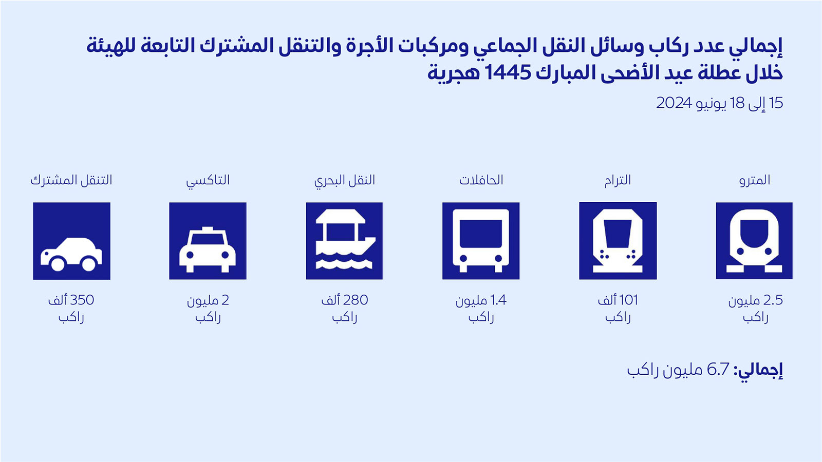 وأوضحت الهيئة أن عدد ركاب المترو بخطيه الأحمر والأخضر، خلال العطلة، وصل إلى مليونين و500 ألف راكب، بينما بلغ عدد ركاب الترام أكثر من 101 ألف راكب، وبلغ عدد ركاب الحافلات العامة مليوناً و400 ألف راكب، ووصل عدد ركاب وسائل النقل البحري إلى 280 ألف راكب، ونقلت مركبات الأجرة 2 مليون راكب، فيما سجلت أعداد الركاب عبر مركبات التنقّل المشترك 350 ألف راكب.
