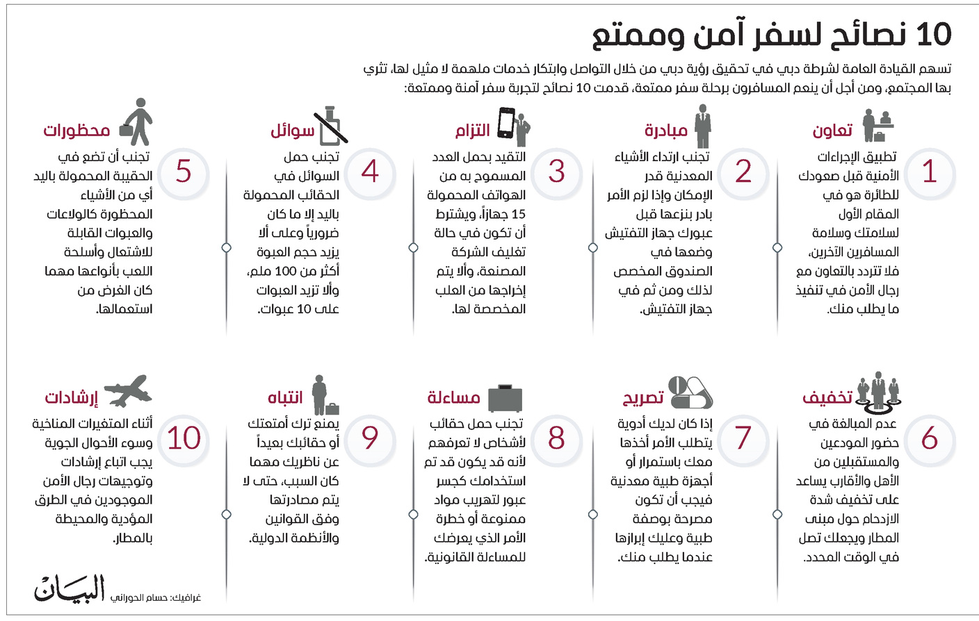 لافتاً إلى أنه يجب على المسافرين الاطلاع على لائحة الممنوعات على الموقع الخاص بمطارات دبي أو بالتواصل مع مكاتب وشركات الطيران لمعرفة مواصفات البطاريات المحظورة وكمية المسموح منها سواء في حقيبة السفر المشحونة أم المحمولة باليد داخل الطائرة.