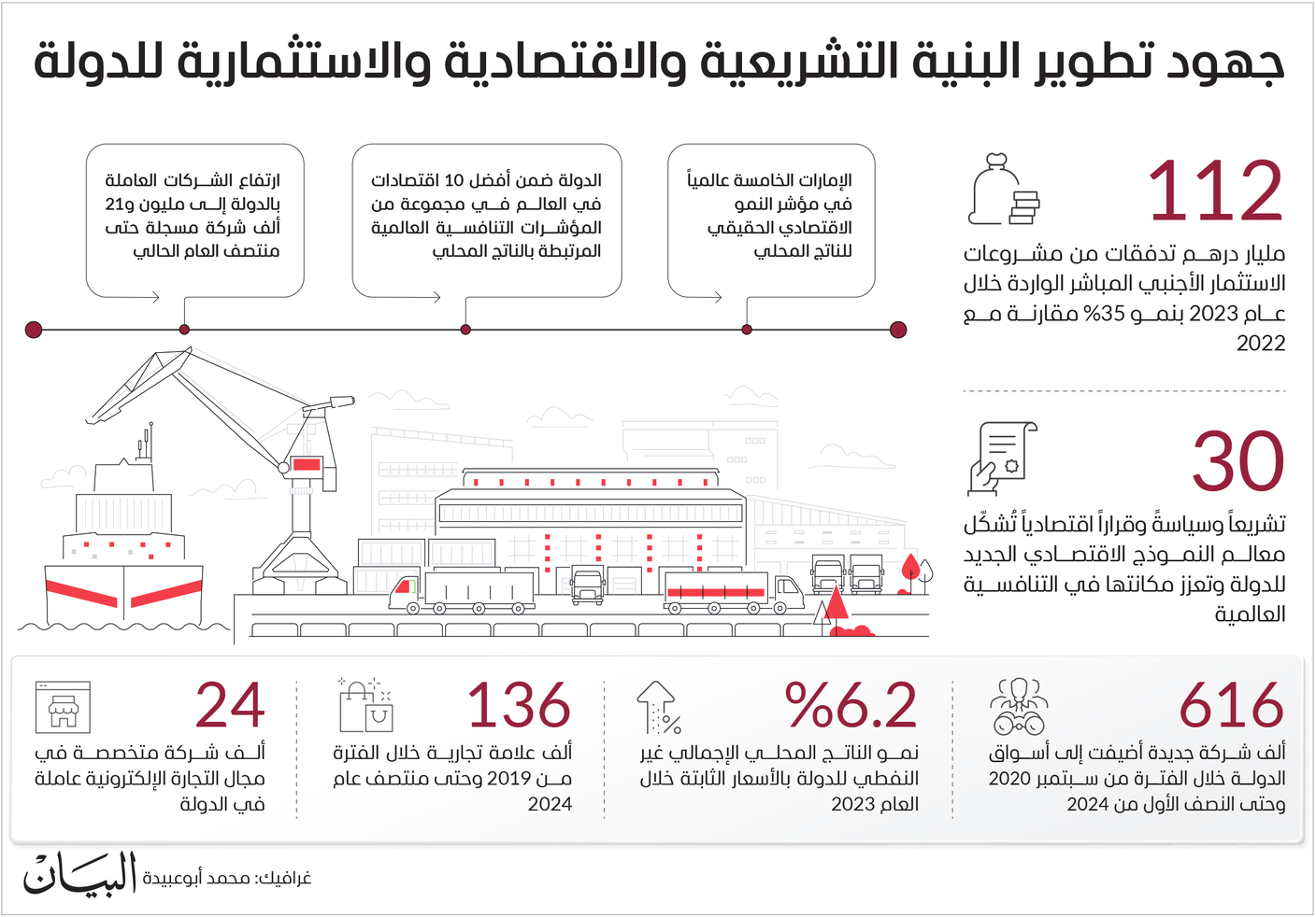 كما أسهمت التشريعات والسياسات الاقتصادية في إضافة 616 ألف شركة جديدة إلى أسواق الدولة خلال الفترة من سبتمبر 2020 حتى النصف الأول من العام 2024، وتسجيل الدولة تدفقات من مشروعات الاستثمار الأجنبي المباشر الواردة خلال عام 2023 بلغت أكثر من 112 مليار درهم، بنسبة نمو بلغت نحو 35% مقارنة مع عام 2022، وتسجيل أكثر من 136 ألف علامة تجارية خلال الفترة من 2019 حتى منتصف عام 2024، كما وأسهمت هذه التحديثات في جعل دولة الإمارات بيئة أعمال تنافسية للتجارة من خلال وسائل التقنية الحديثة وانعكاس ذلك في وجود أكثر من 24 ألف شركة متخصصة في مجال التجارة الإلكترونية عاملة في الدولة.