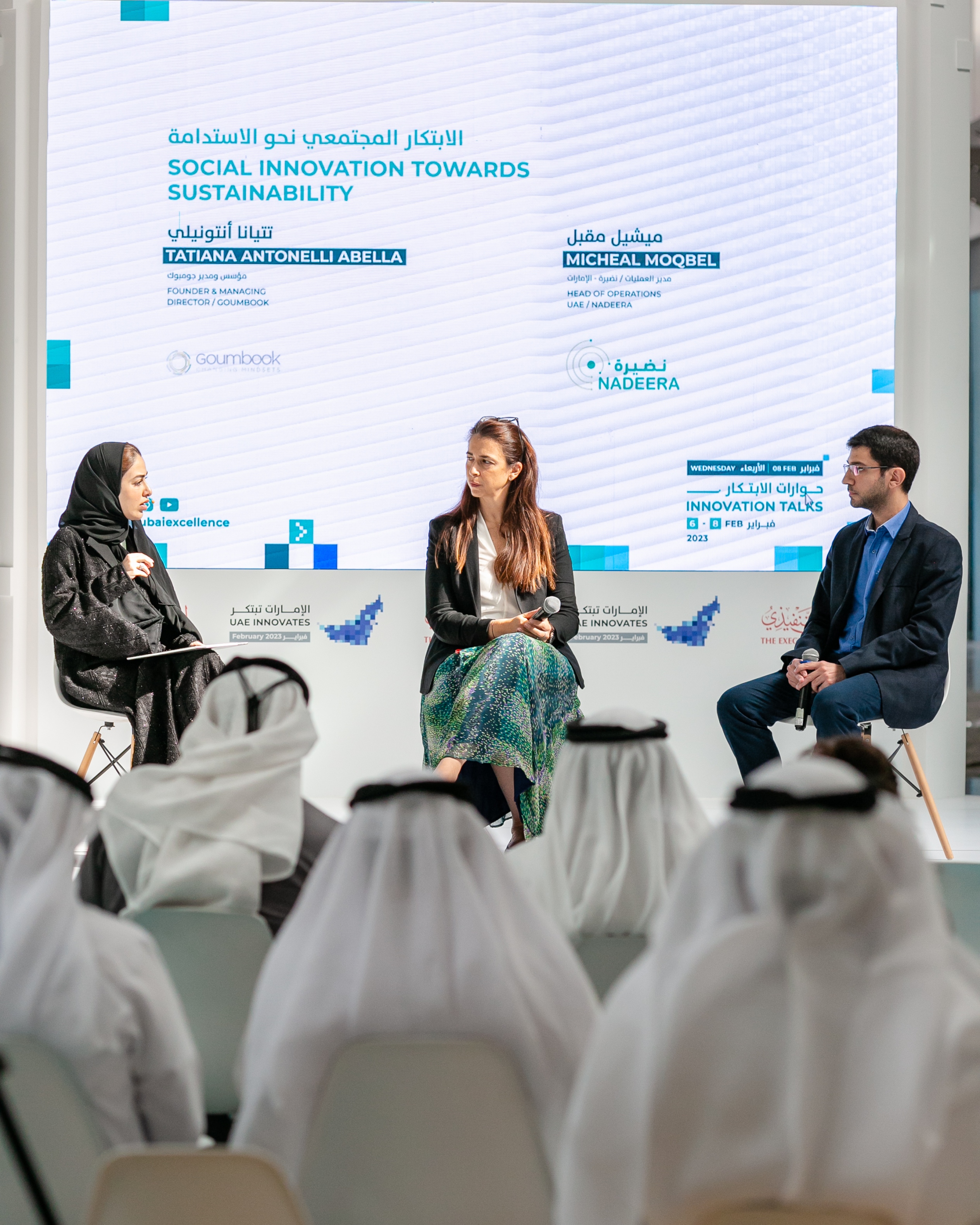 وفي جلسة نقاشية عنوانها "الابتكار المجتمعي نحو الاستدامة"، تحدثت تتيانا أنتونيلي –مؤسس ومدير جومبوك، عن تجربة المؤسسة في إطلاق مبادرة "دبي تستطيع" للاستدامة في فبراير 2022، بهدف الحد من المواد البلاستيكية ذات الاستخدام الواحد تحت رعاية سمو الشيخ حمدان بن محمد بن راشد آل مكتوم، ولي عهد دبي رئيس المجلس التنفيذي لإمارة دبي مضيفة أن الحملة مثّلت "نموذجاً رائعاً لدور الابتكار في صنع ثقافة معيشية واعية". وحثت أنتونيلي على إشراك المجتمع بكافة فئاته إلى جانب الحكومات في حل تحديات الرعاية الصحية الجيدة والأمن الغذائي وضمان ازدهار البشرية للعقود المقبلة.