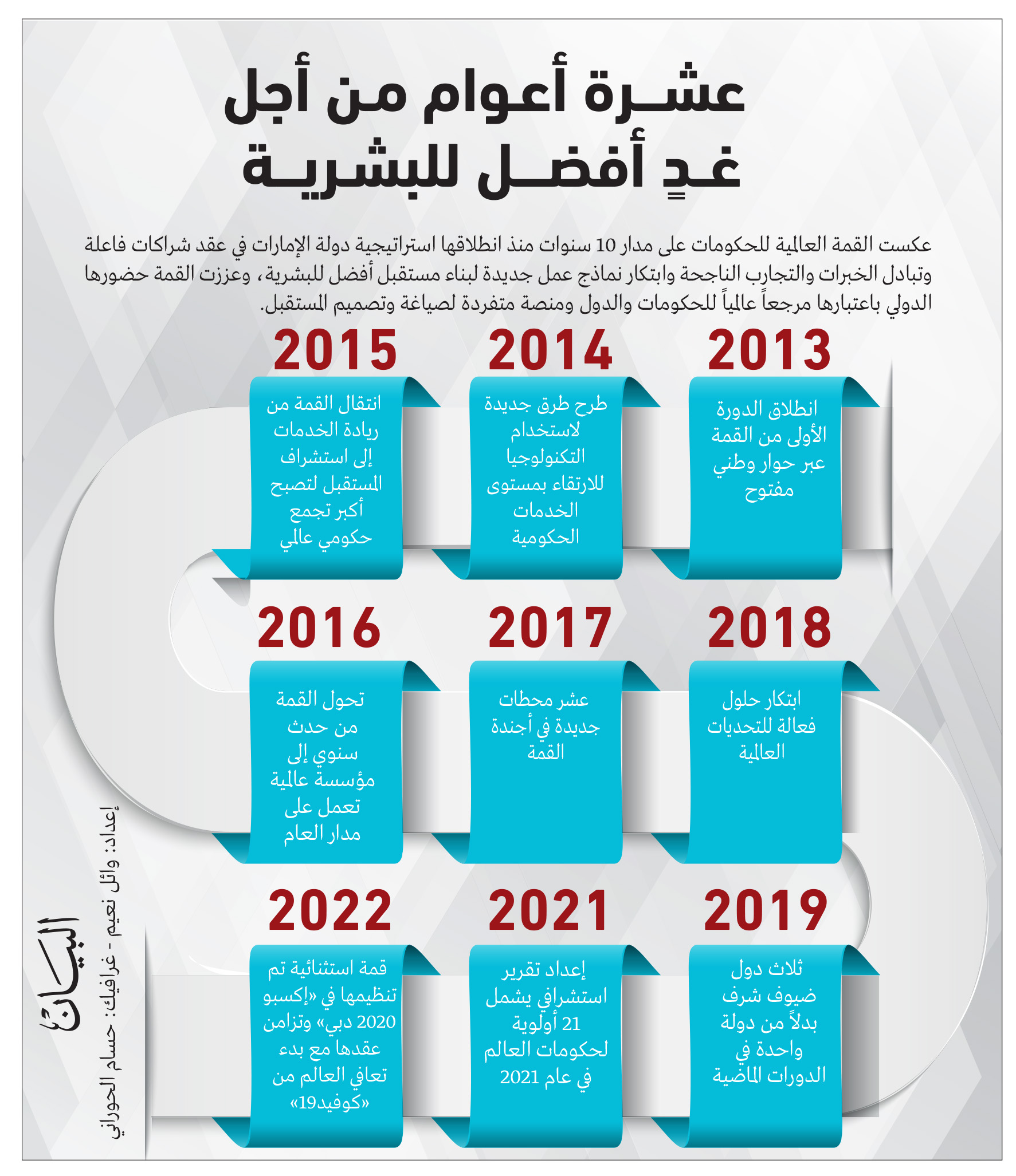 وشهدت القمة عبر تاريخها تحولات وتغييرات جذرية كانت في كل دورة تقودها إلى نجاحات أكبر وأعظم، لتصبح أكبر تجمع عالمي متخصص في استشراف حكومات المستقبل، ولترقى القمة عبر المحطات الجديدة في أجندتها، لتكون المنصة الأكثر تأثيراً عالمياً في تصميم وصناعة توجهات العالم ووضح الحلول الأكثر نجاحاً لمواجهة تحدياته، حيث أثمرت حواراتها الجامعة الكثير من المبادرات التي كان لها أثر واضح في حياة المجتمعات حول العالم.وحظيت الدورة السابقة للقمة العالمية للحكومات بأهمية خاصة، حيث مثلت مع تزامنها مع «إكسبو 2020 دبي»، المنتدى العالمي الأكثر حيوية في ظل بدء تعافي دول العالم من جائحة «كوفيد19» ما جعل من نجاحها في جميع العالم في مثل هذا الظرف الصعب بحوارات بناءة وكبرى، نقطة تفاؤل وانطلاق لجميع القطاعات المؤثرة في حياة البشرية، في تجاوزها للتأثيرات التي أفرزتها هذه الجائحة.