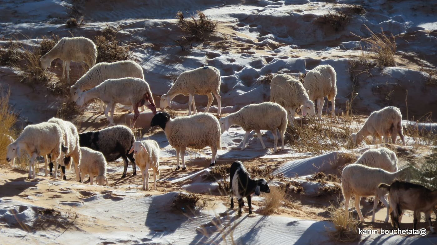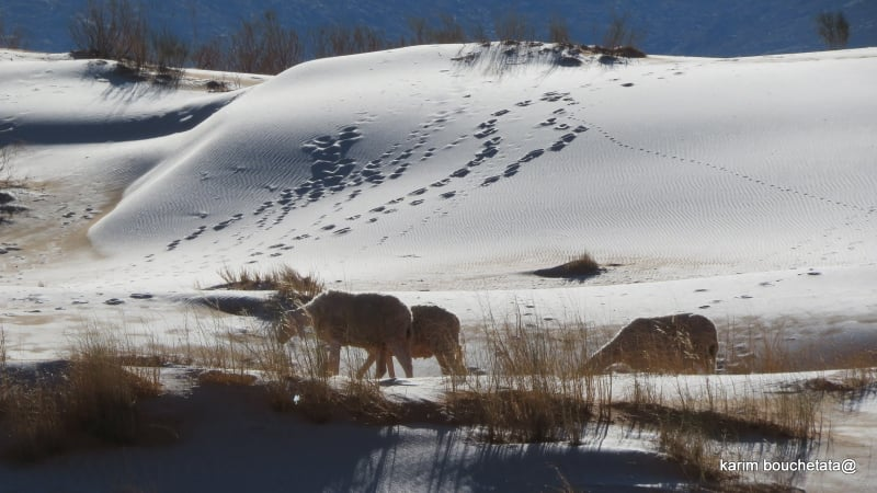 وشوهدت الأغنام تقف على الكثبان الرملية المغطاة بالجليد يوم الأربعاء، حيث انخفضت درجات الحرارة إلى -3 درجة مئوية.