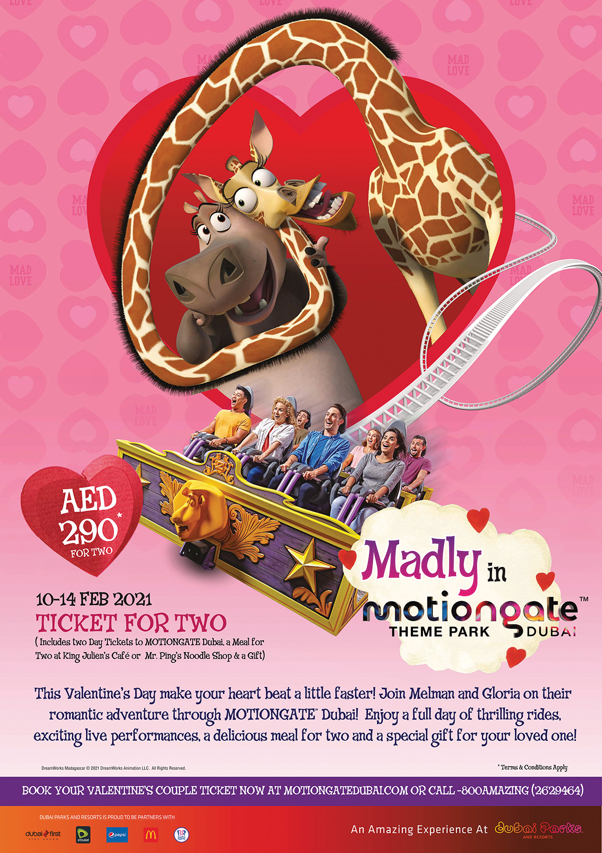 وتتوفر التذاكر الخاصة لشخصين بدءاً من 4 فبراير وحتى 13 فبراير، ويمكن للضيوف زيارة المنتزه في أي يوم بدءاً من 10 حتى 14 فبراير، 2021 حيث يمكن حجز التذاكر عبر الموقع www.motiongatedubai.com، وعند البوابة أو من خلال مركز الاتصال على 800amazing (2629464).