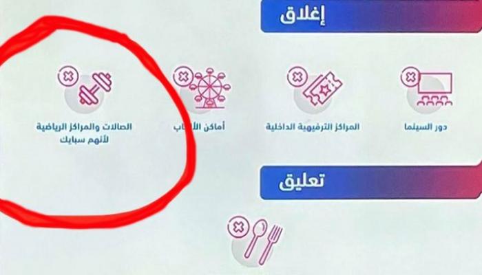 إلا أن اللوحة الإرشادية التي كانت خلفه ظهر عليها أن سبب إغلاق الصالات والمراكز الرياضية "لأنهم سبايك".