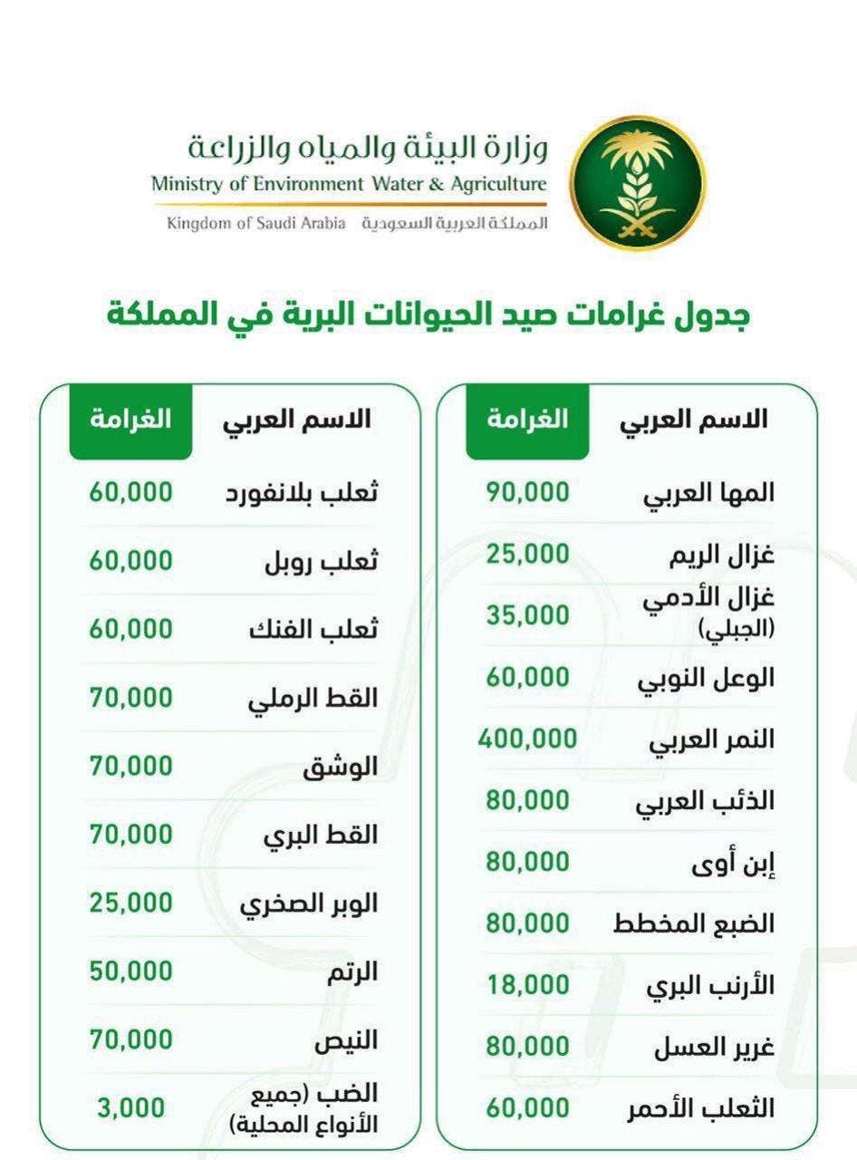 وأشارت الوزارة، إلى أن اللائحة التنفيذية حددت جدول الغرامات لمخالفات أحكام النظام والتي تشمل: صيد الحيوانات المحظورة، والصيد دون ترخيص أو مخالفة أماكن وأوقات الصيد أو عرض وبيع الكائنات المصيدة دون ترخيص أو استخدام الأسلحة والأدوات المحظورة في الصيد.