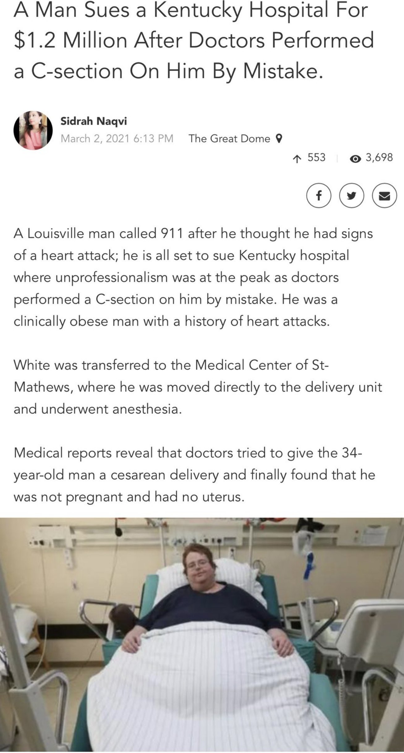 وبعد أن حضرت الإسعاف تم نقل الرجل إلى المركز الطبي في سانت ماثيوز، وهناك وقع الأوراق المطلوبة، ليأخذوه بالخطأ إلى قسم النساء والولادة ويخضع للتخدير، وقام الطبيب بإجراء العملية لكنه اكتشف أنه لا يوجد جنين ولا حتى رحم، لأن الشخص المخدر أمامه رجل أساساً وليس امرأة. وفقاً لموقع " folkspaper".