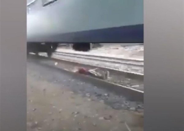 وانتشر مقطع فيديو يظهر القطار وهو يسير بسرعة كبيرة، بينما كان الشاب ممددا بين طرفي سكة الحديد في وضعية خطيرة.