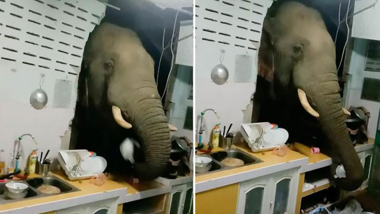 وقام صاحب المنزل بتصوير الحادثة مباشرة على الهواء، ونشرها على شبكة التواصل الاجتماعي، حيث أظهرت اللقطات اختراق الفيل للجدار الذي أوصله إلى المطبخ.