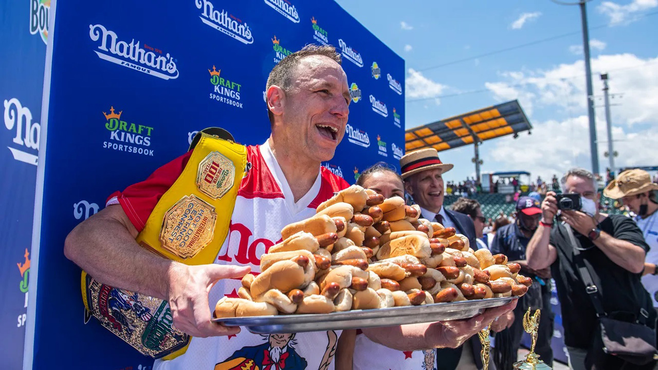 وتفوق جوي تشيسنات، صاحب التصنيف الأعلى عالميا في مسابقات تناول الـ"هوت دوغ"، على أقرب منافسيه بفارق 26 شطيرة "هوت دوغ" إضافية. كما حطّم الرقم القياسي السابق الذي حققه شخصيا في اليوم الوطني الأميركي في الرابع من يوليو العام الماضي حين التهم 75 "هوت دوغ".
