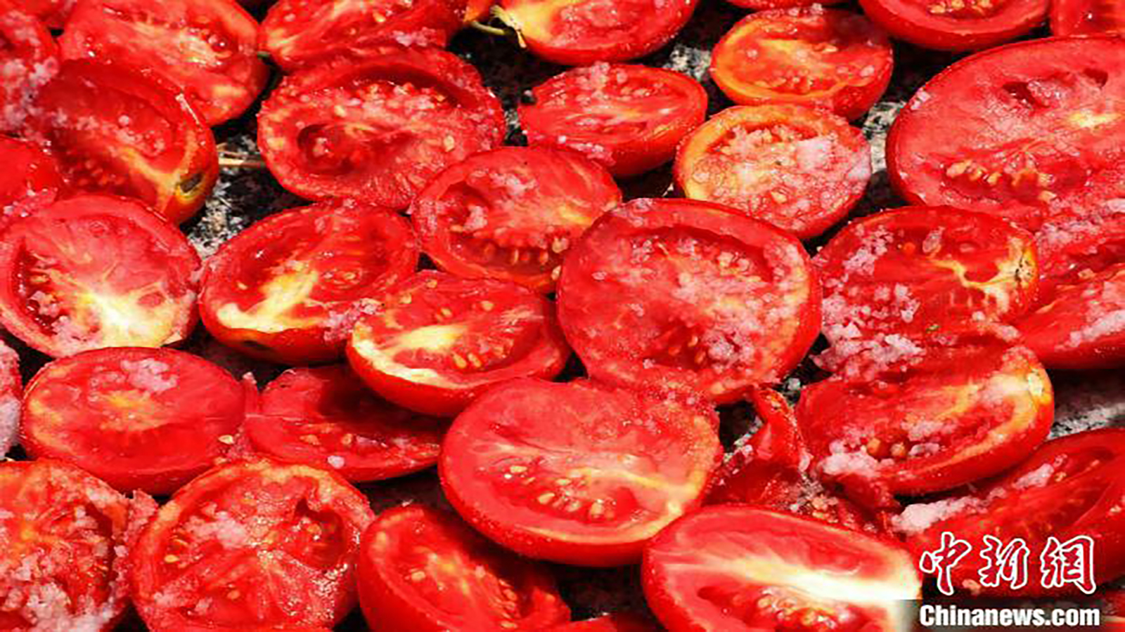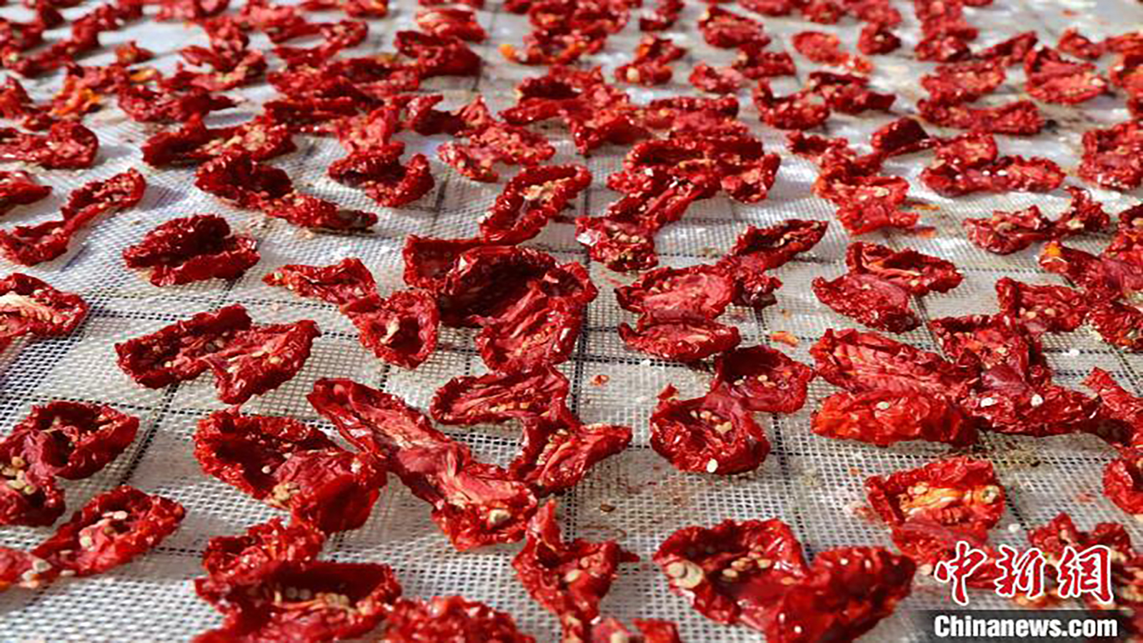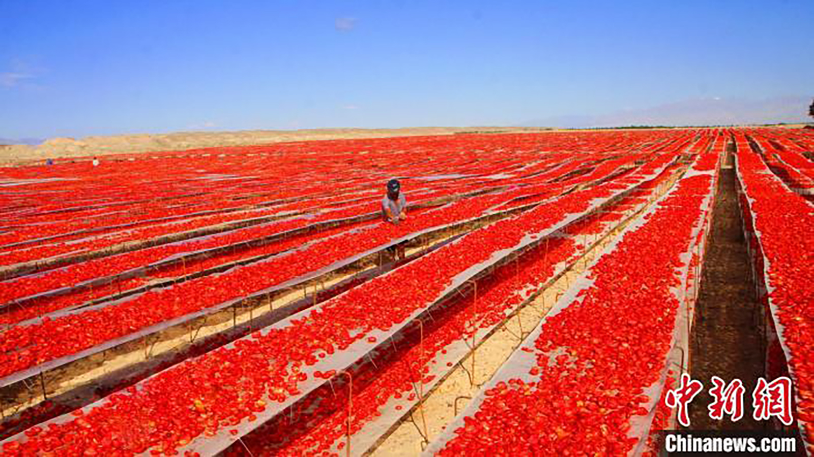 ومع موسم جني الطماطم تحولت صحراء جوبي الى لوحة فنية طبيعية غاية الجمال بلون الرمال الذهبية والطماطم الحمراء التي تملأ أسِرَّة التجفيف في مشهد مذهل.