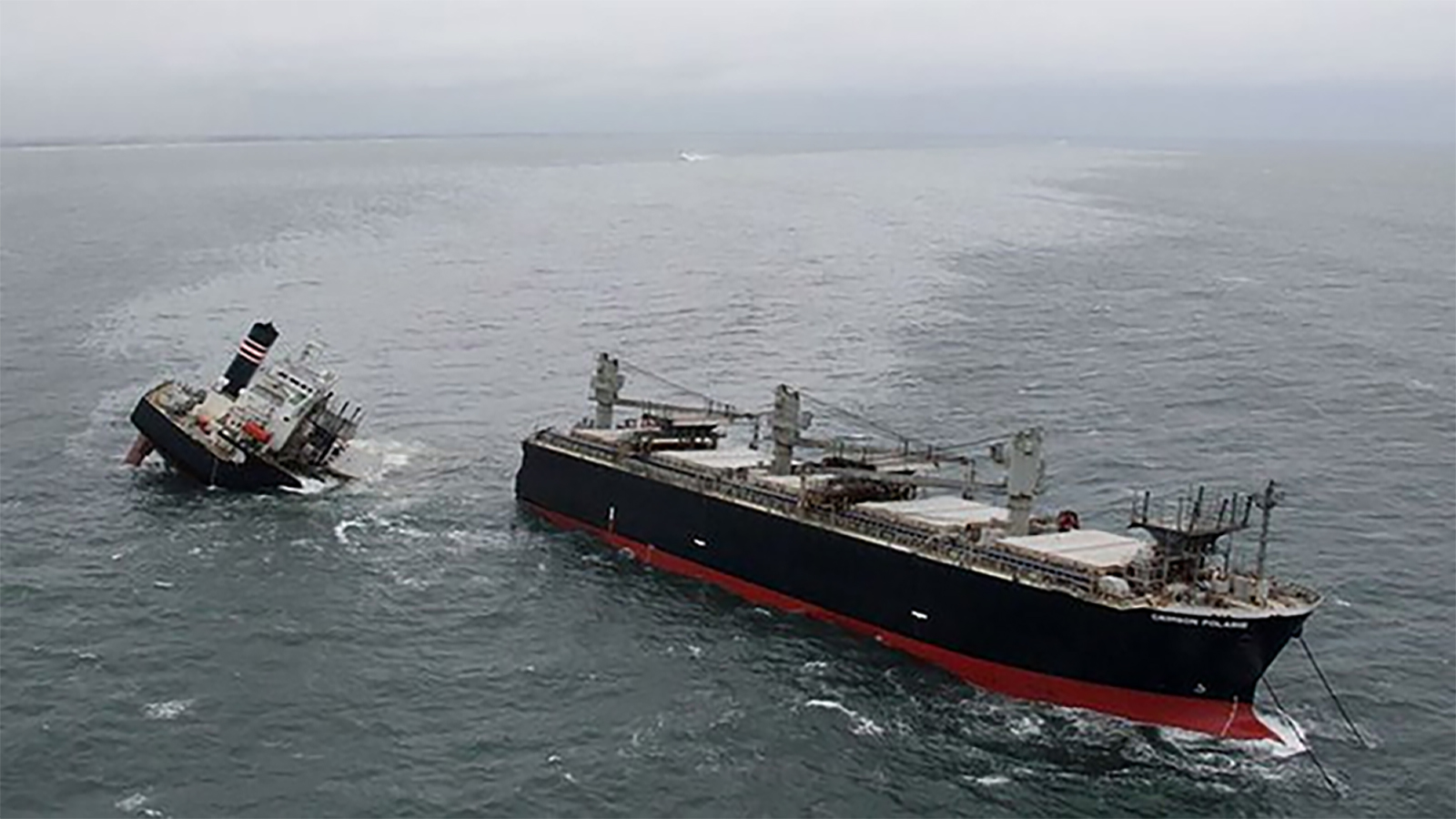 وذكر خفر السواحل، أن السفينة التي كانت في نهاية رحلة من تايلاند انشطرت إلى نصفين أمس الخميس. وشوهدت بقعة زيت بطول 5.1 كيلومتر وعرض كيلومتر تقريبا في وقت لاحق، لكن قوارب الدورية اتخذت إجراءات لاحتوائها.
