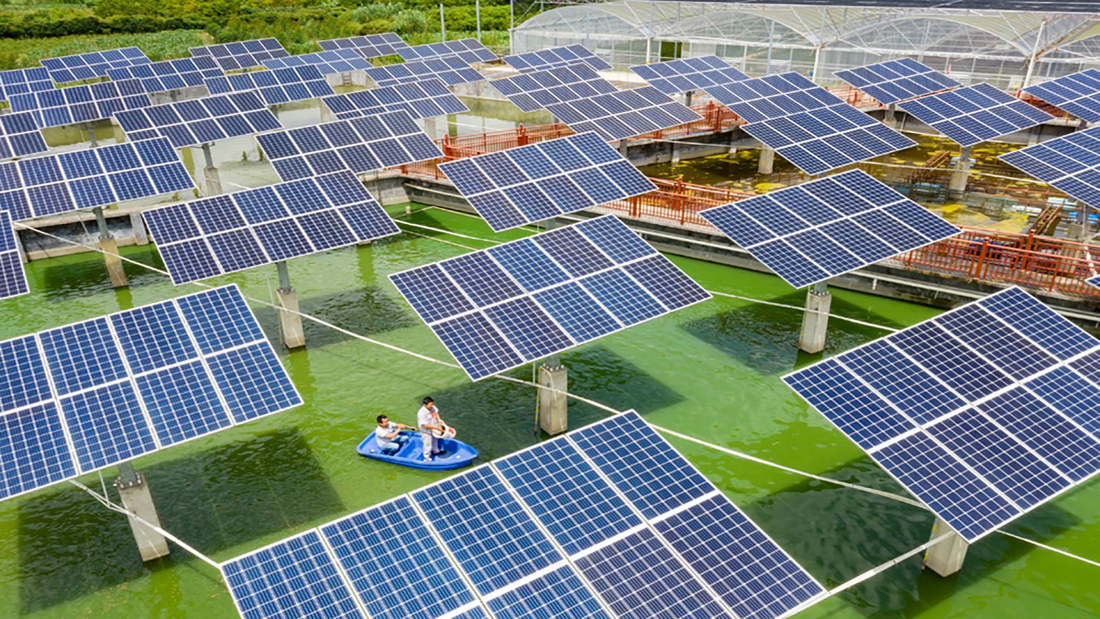 تظهر الصور الجوية الملتقطة في يوم 17 أغسطس الجاري، عمّالا وهم بصدد إطعام الأسماك والروبيان تحت ألواح توليد الطاقة الكهروضوئية المثبتة فوق أحواض الماء، بقرية قاو دوي من محافظة منغشان بقوانغشي.