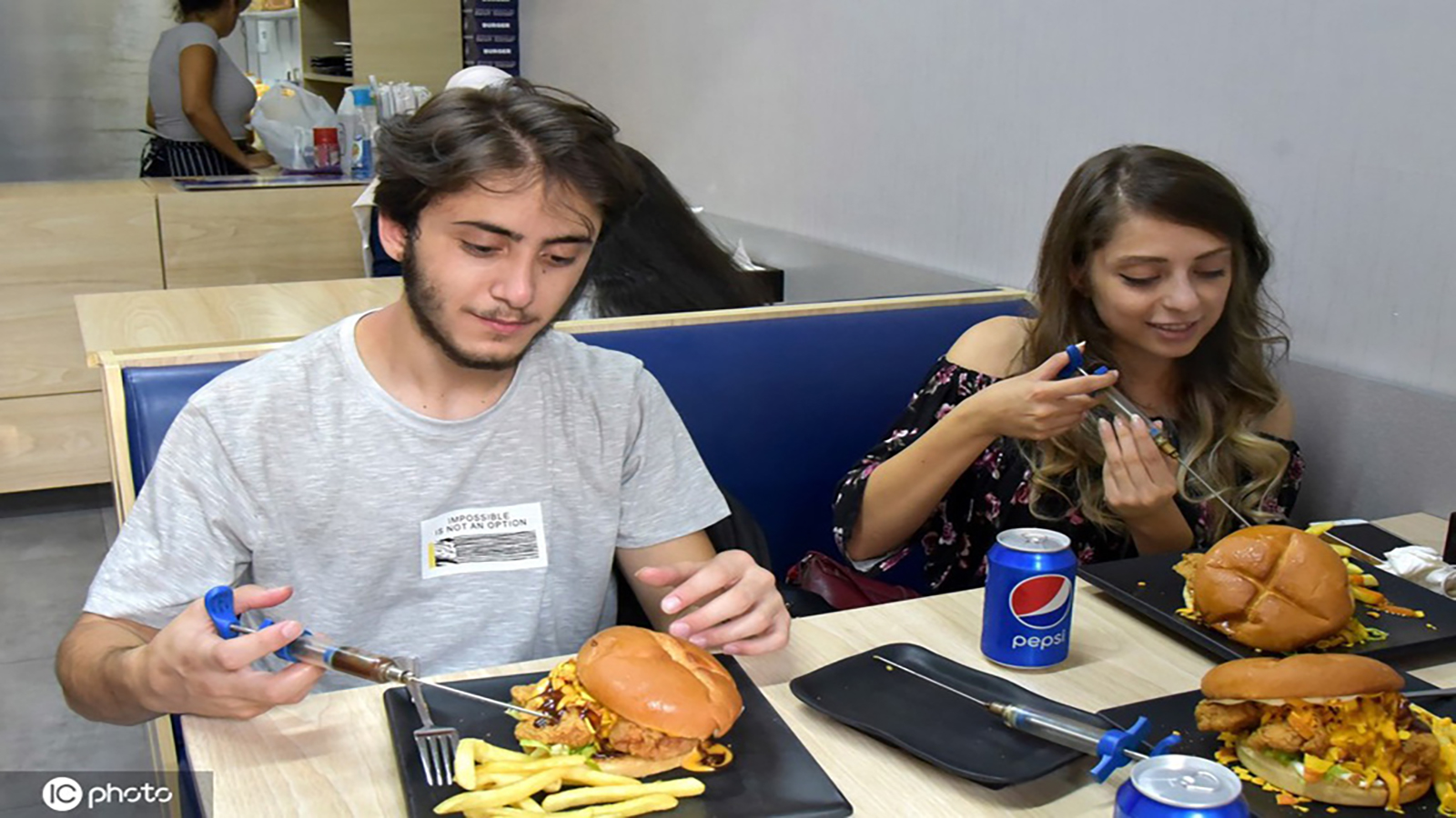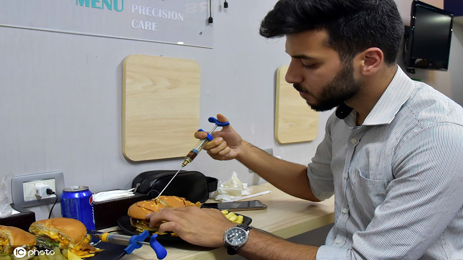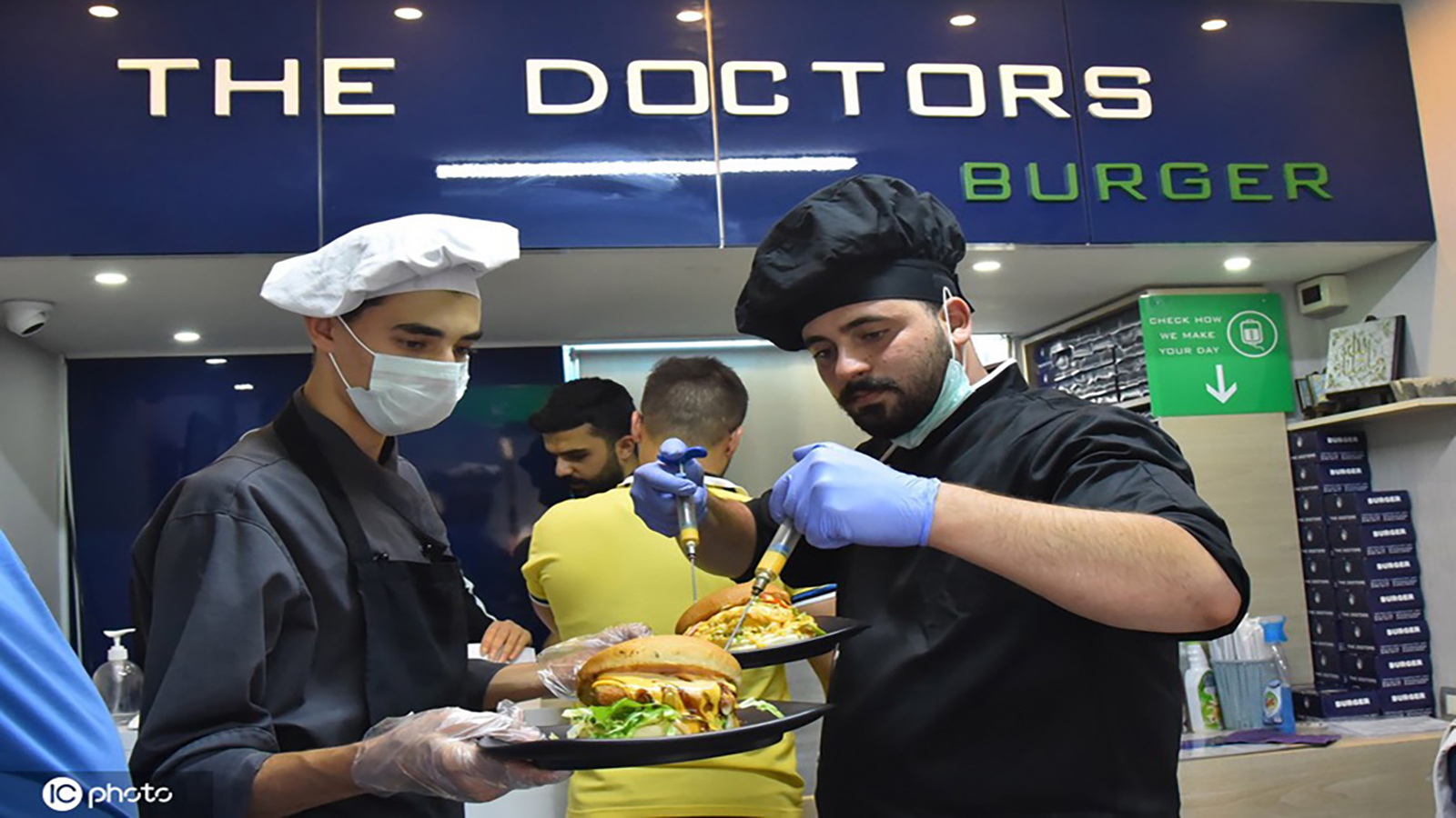ويلتزم مقدمو الوجبات بارتداء زي طبي كامل، مع تقديم الصلصات والمايونيز والكاتشب داخل حواقن، حيث يحقن الزبون الساندويتش بهذه الإضافات وكأنه يحقنه بمواد دوائية، الأمر الذي لقي رواجاً كبيراً لدى رواد مواقع التواصل، الذين أبدوا إعجابهم بالفكرة ورغبتهم في تجربة تناول وجباتهم بالمطعم.