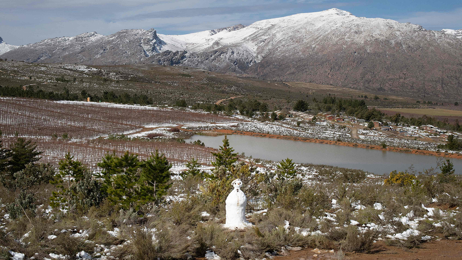 فقد لبست إحدى مناطق جنوب إفريقيا ثوبا أبيض بعد سقوط كميات معتبرة من الثلوج على الجبال والتلال الواقعة قرب مدينة سيريس التي تبعد عن كاب تاون بمسافة 180 كيلومترا، بحسب "يورونيوز".