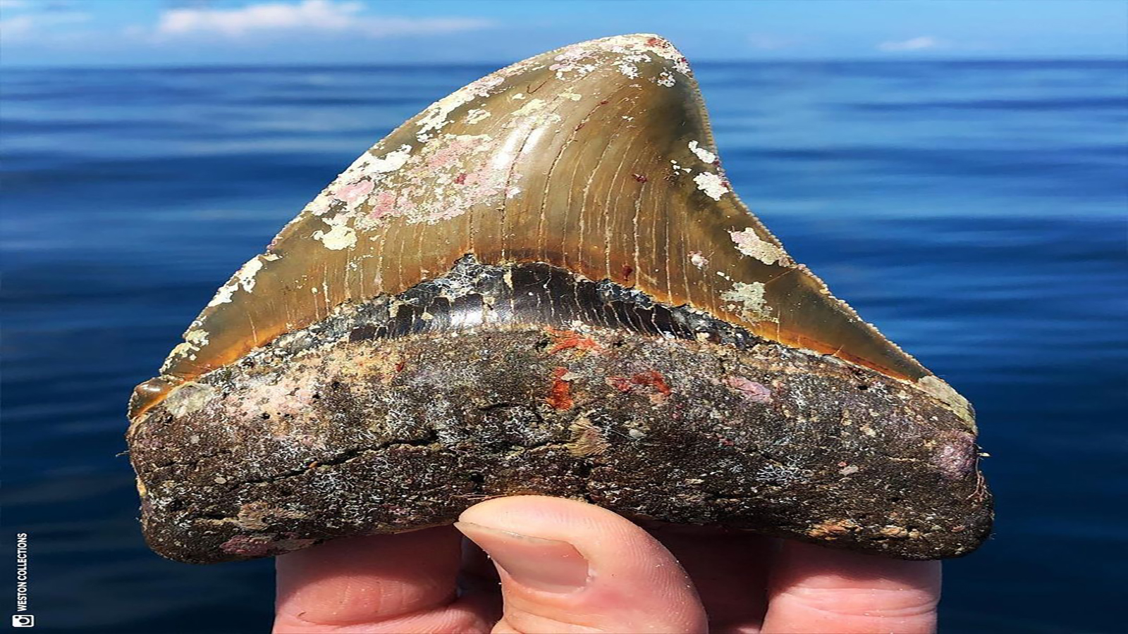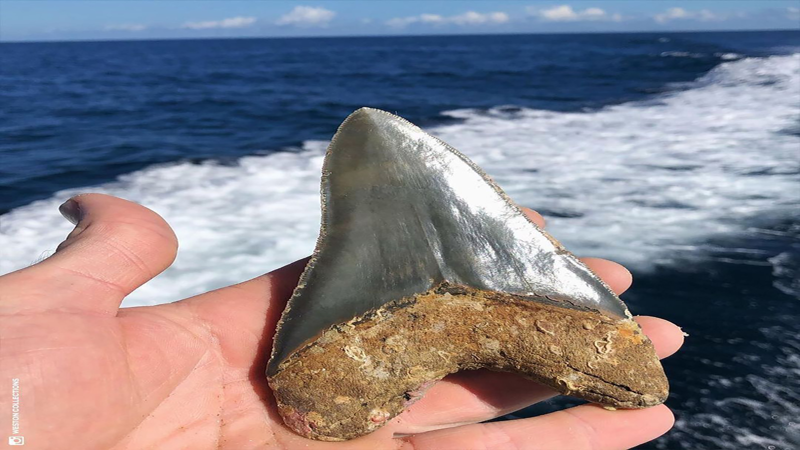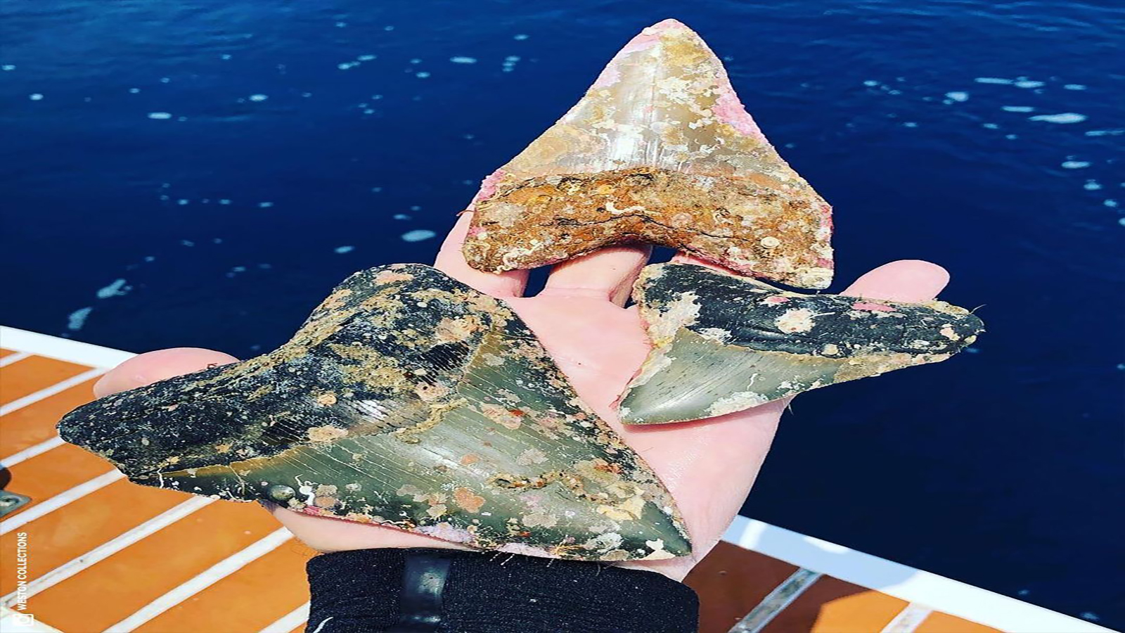 تم العثور على أسنان قرش الميغالودون هذه قبالة ساحل ولاية كارولينا الشمالية بواسطة غواصين من مجموعة ويستون كوليكشنز، وفق (futura.sciences).