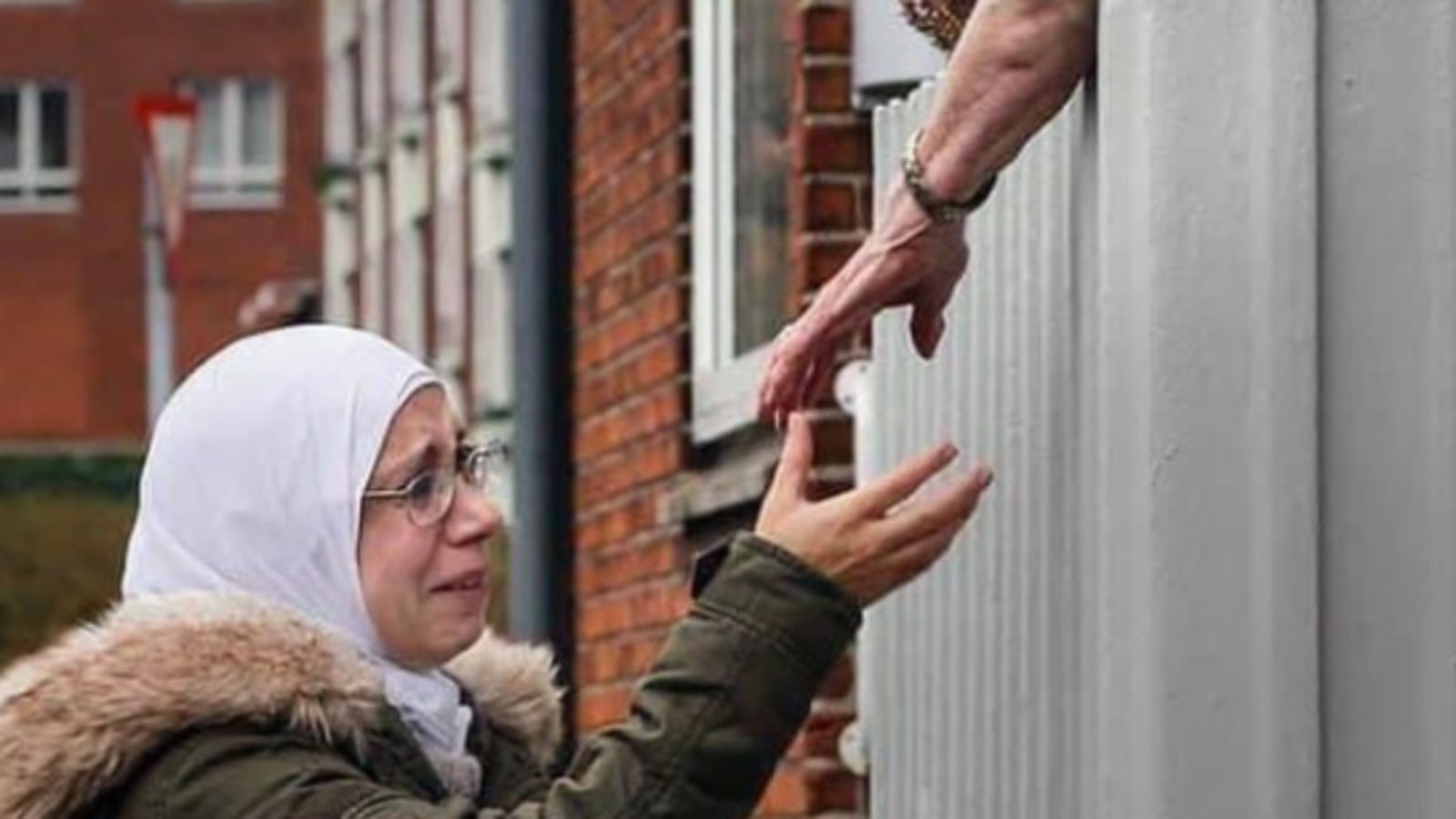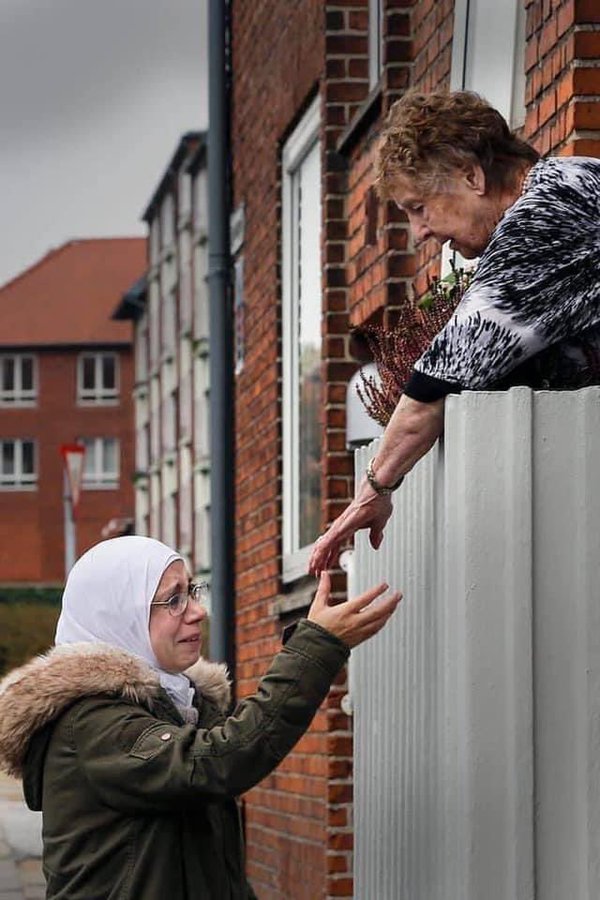 شارك عدد من الناشطين على مواقع التواصل الاجتماعي خلال الفترة الماضية صورة لسيدة سورية وهي تودع بالدموع جارتها الدنماركية التي مدت لها يدها من نافذة بيتها، وكأنها تقول "قلبي معك.. سامحينا". في مشهد يفطر القلب.
