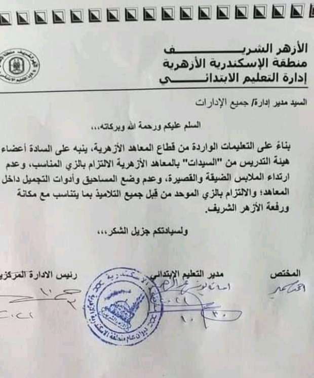 قرَّرت إدارة التعليم الابتدائي في منطقة الإسكندرية الأزهرية، منع أعضاء هيئة التدريس من السيدات بالمعاهد الأزهرية، من ارتداء الملابس الضيقة والقصيرة، علاوة على مطالبتهنّ بعدم وضع المساحيق وأدوات التجميل داخل المعاهد، والالتزام بالزي المناسب.