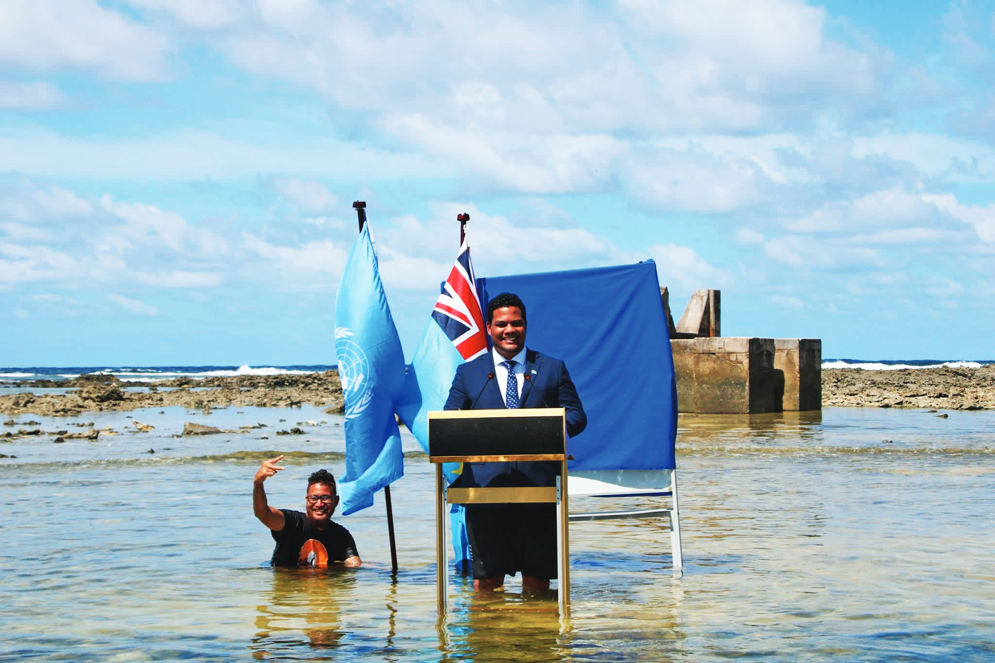 اتخذ وزير دولة توفالو التي تقع بالمحيط الهادئ نهجاً مغايراً أخيراً للتعبير عن المخاطر التي تواجهها بسبب آثار أزمة المناخ، لتنتشر صورة الخطاب الذي تم بثه من المحيط مباشرةً - والمياه تغمر ركبتي وزير الخارجية سيمون كوفي - على وسائل التواصل الاجتماعي.